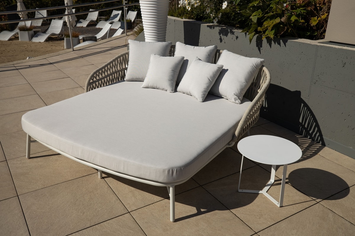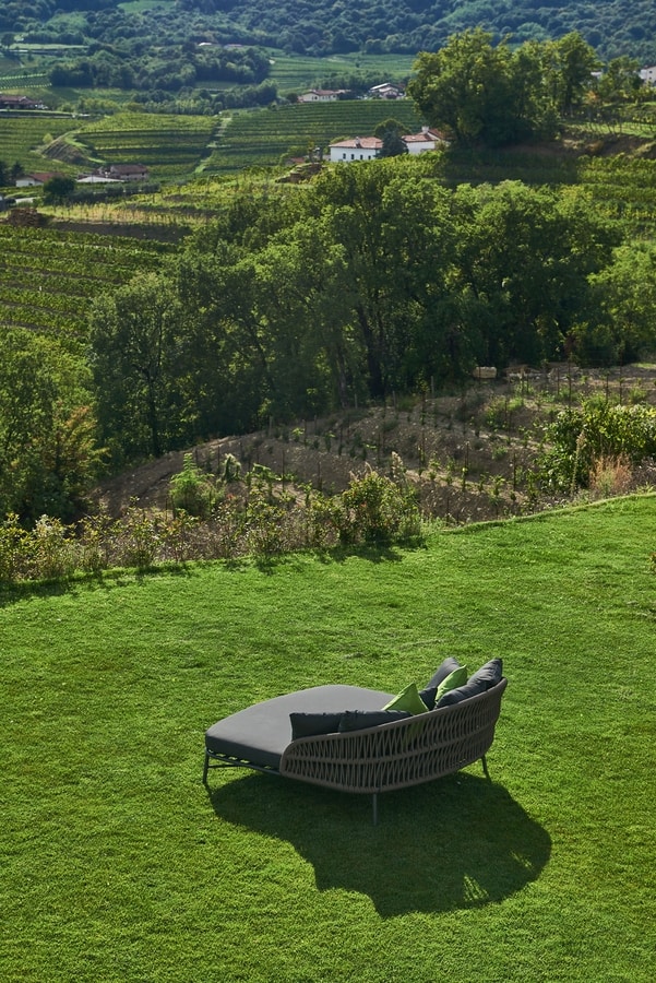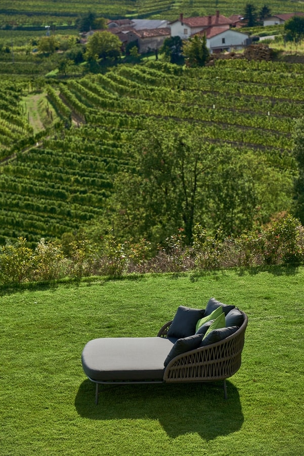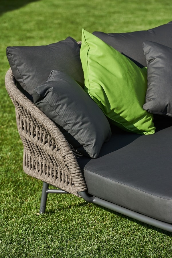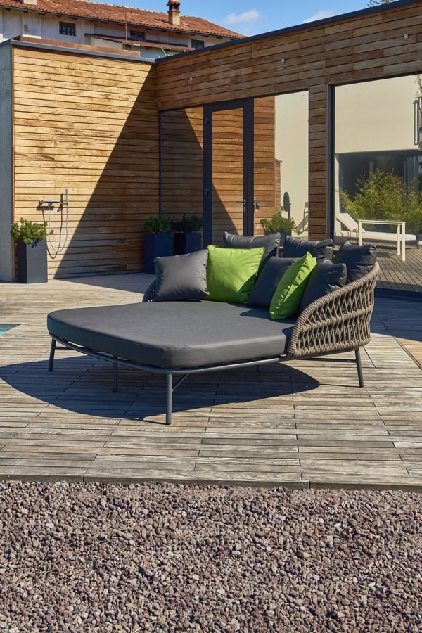 Outdoor-Liege aus Aluminium in Taupe lackiert. Kissen aus Stoff. Wetterfeste und sonnenlichtbeständige (UV) Struktur. Seil mit Gummi innen Textilene-Olefin außen.
