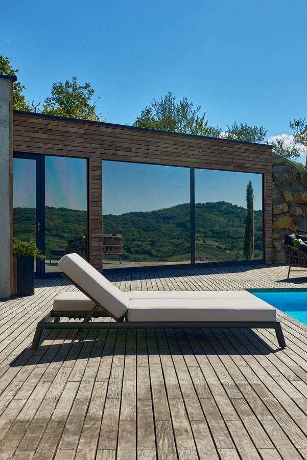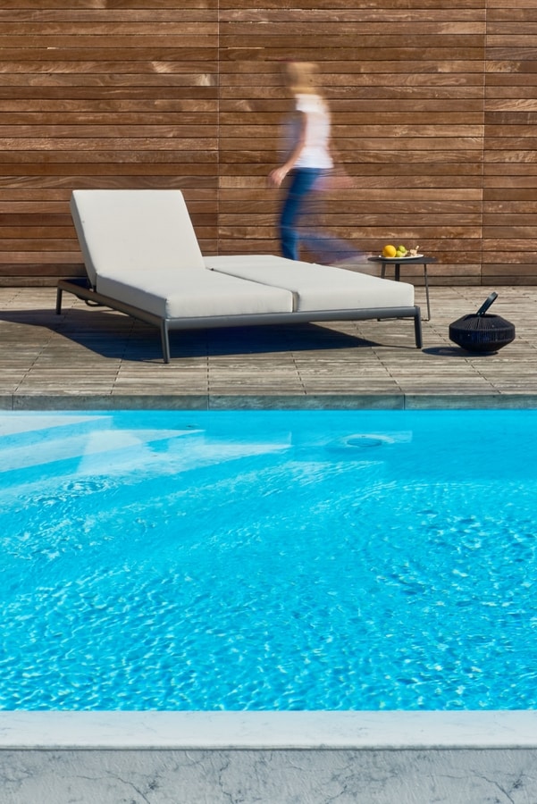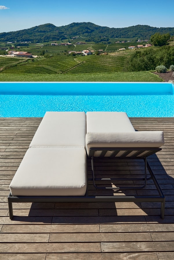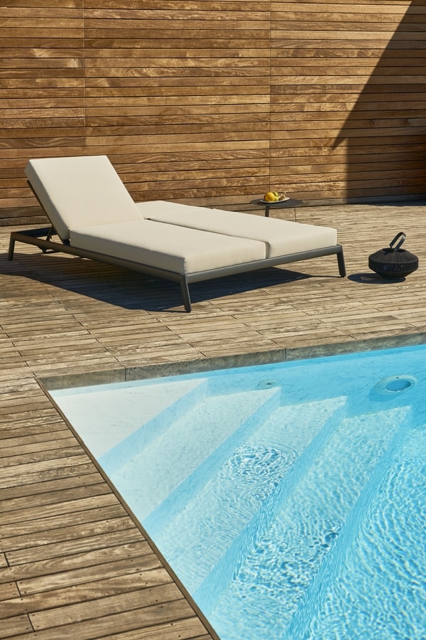 Strenge Linien und geometrisches Design für diese Sonnenliege mit einem Aluminiumrahmen aus sechseckigem Rohr. Ein minimalistisches Möbelstück für eine exklusive Umgebung am Pool oder eine Terrasse mit gehobener Stimmung.