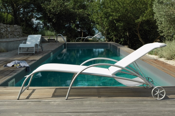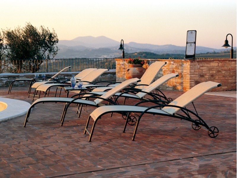 Sonnenliege im Freien, Struktur aus verzinktem Stahlblech, in verschiedenen Farben erhältlich, mit einem Expansionssitz in den Musterfarben.