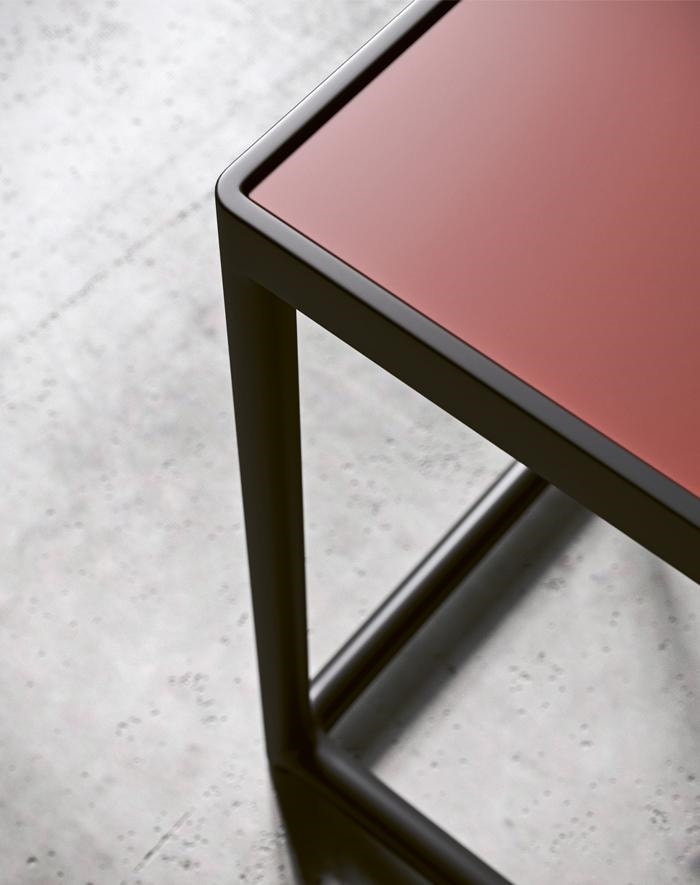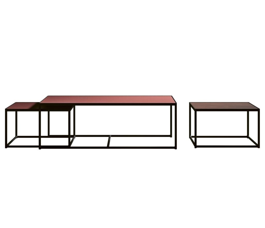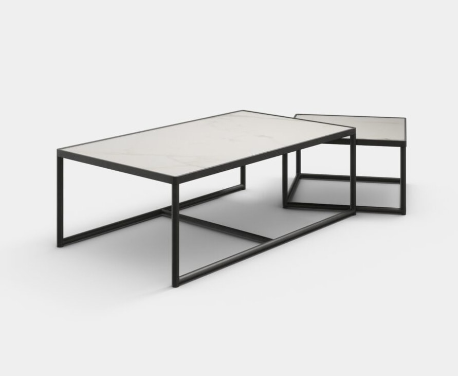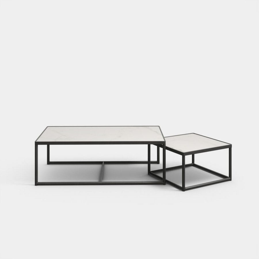 Modularer Couchtisch mit lackiertem Metallrahmen und drei separaten Elementen – einem zentralen Hauptelement und zwei kleineren Elementen an den Seiten. Die Tischplatte ist in einer Vielzahl von Materialien und Ausführungen erhältlich. Bündige Oberseite und Metallstruktur.