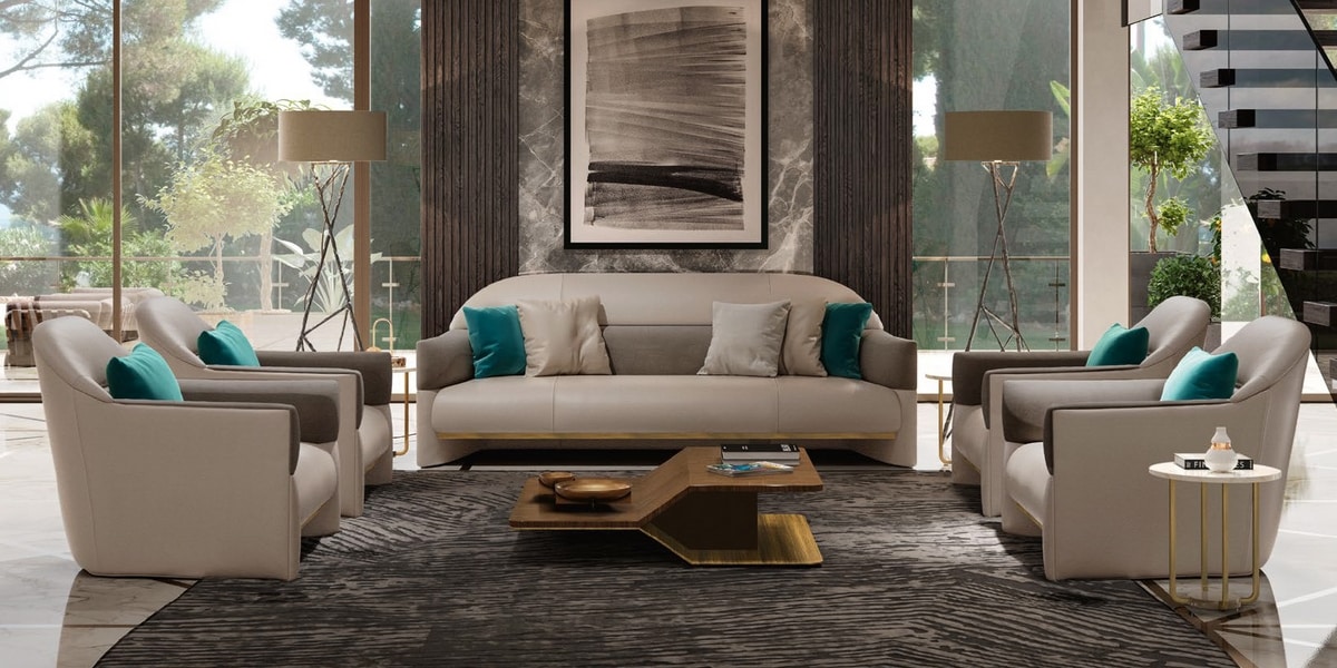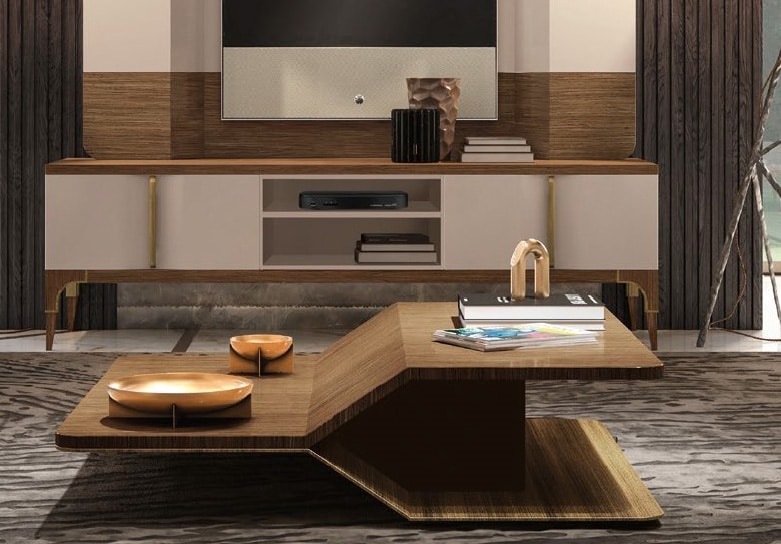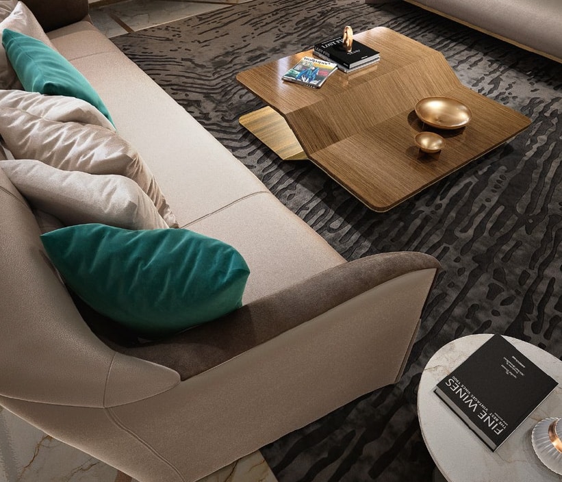Der Wohnbereich erweist sich als hell und gemütlich, kostbare Qualitäten, die aus den gelungenen Kombinationen der Walnuss-Essenz, hellen Lacken, goldenen Metallen und den Stoffen in passenden Farbtönen entstehen. Es ist eine tägliche Einladung zu Gelassenheit und Entspannung in ihrer begehrtesten Form.