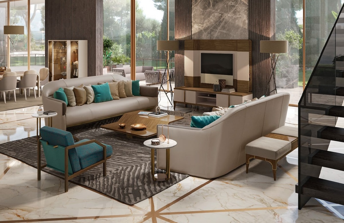 Kunst und zeitlose Schönheit. Die Kollektion Firenze entspringt einer Inspiration, die sich in weichen und eleganten Formen ausdrückt, kombiniert mit metallischen Details und edlem Holz. Alle Elemente nehmen an einem gekonnten Kombinationsspiel verschiedener Materialien teil – das Ergebnis der höchsten italienischen Möbeltradition.