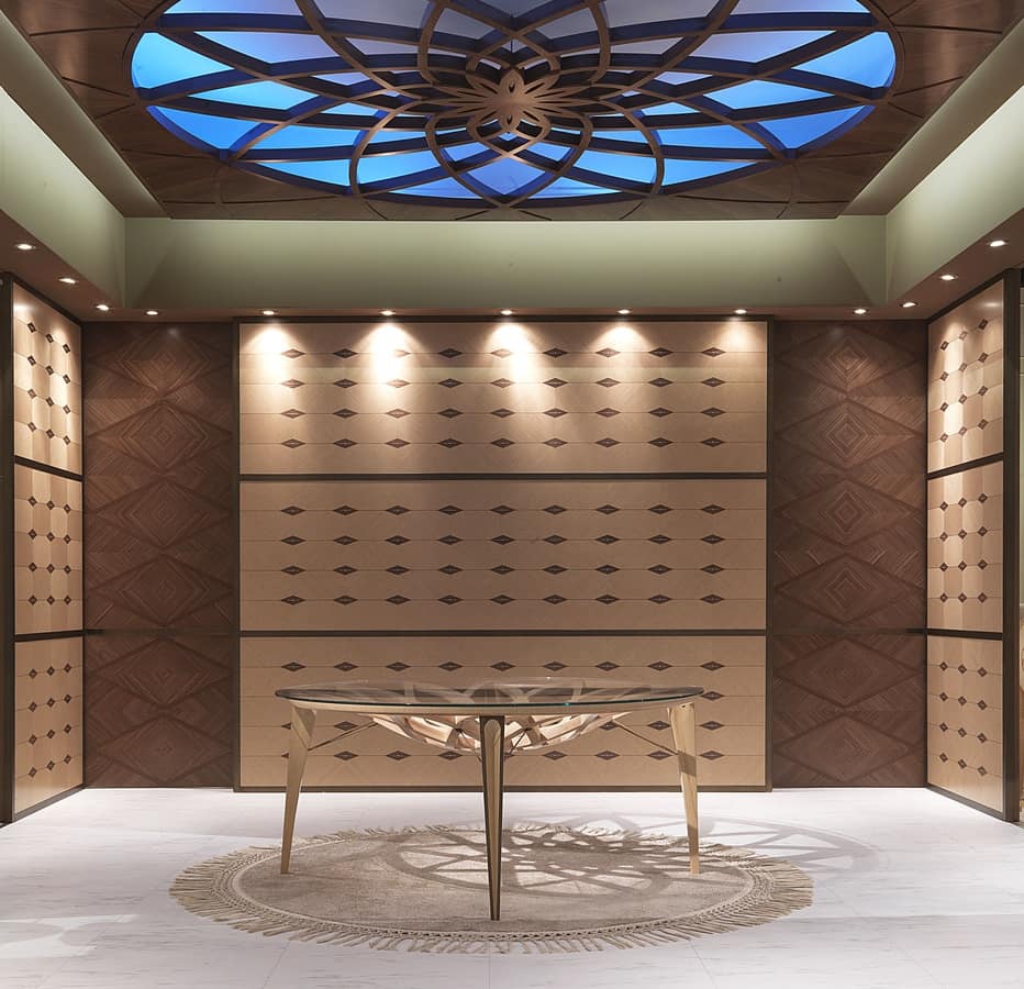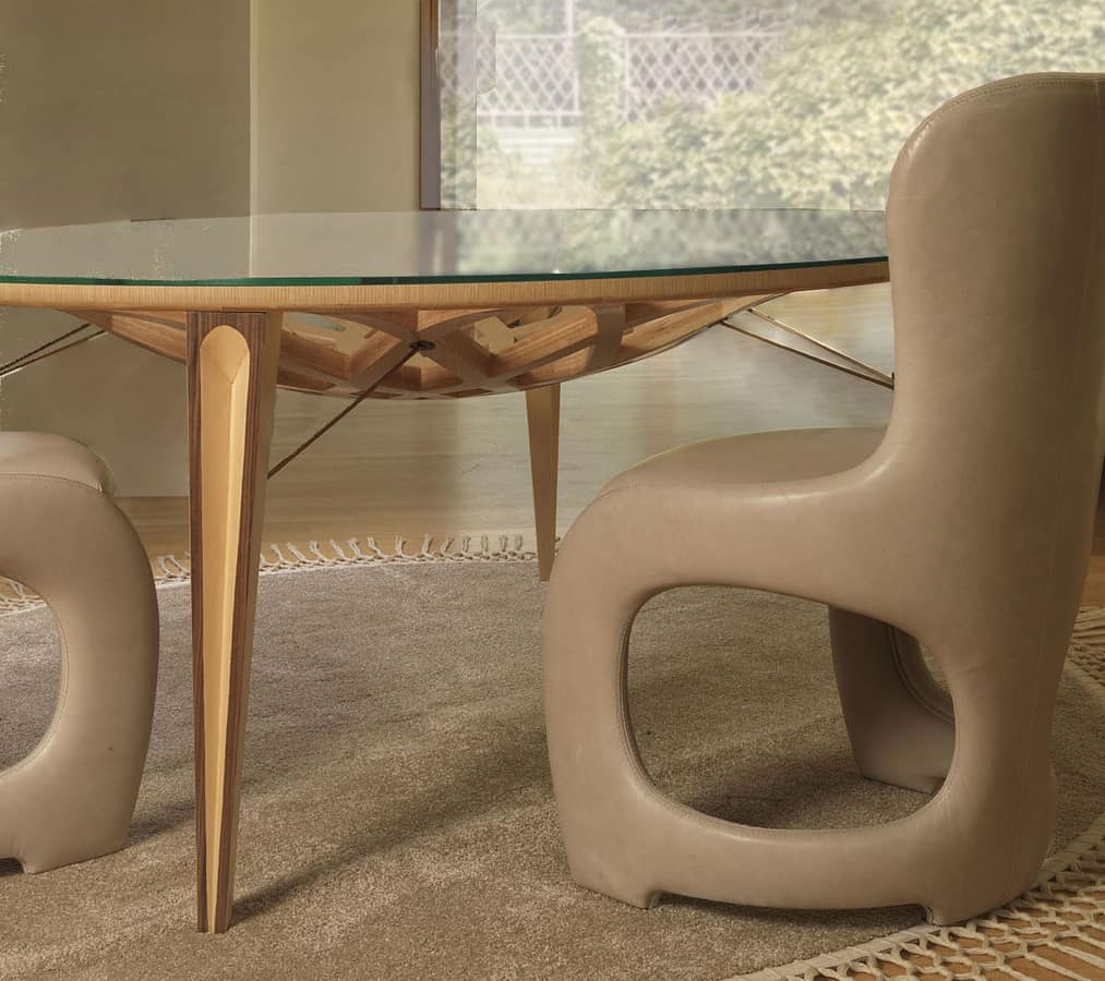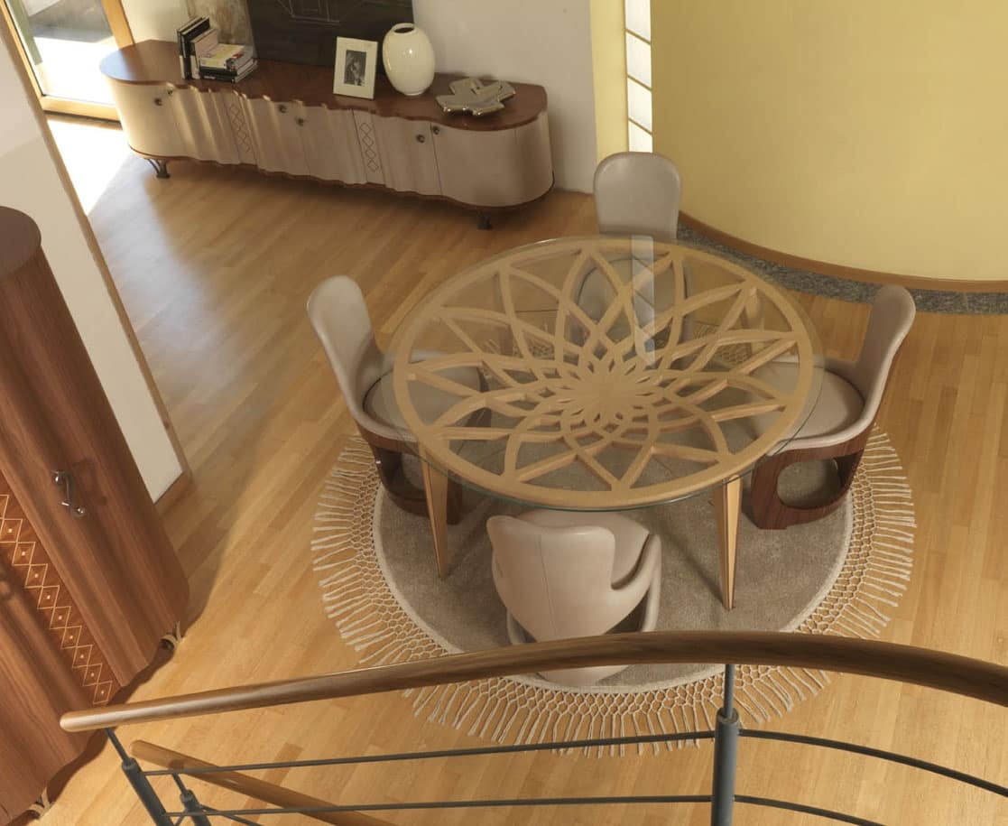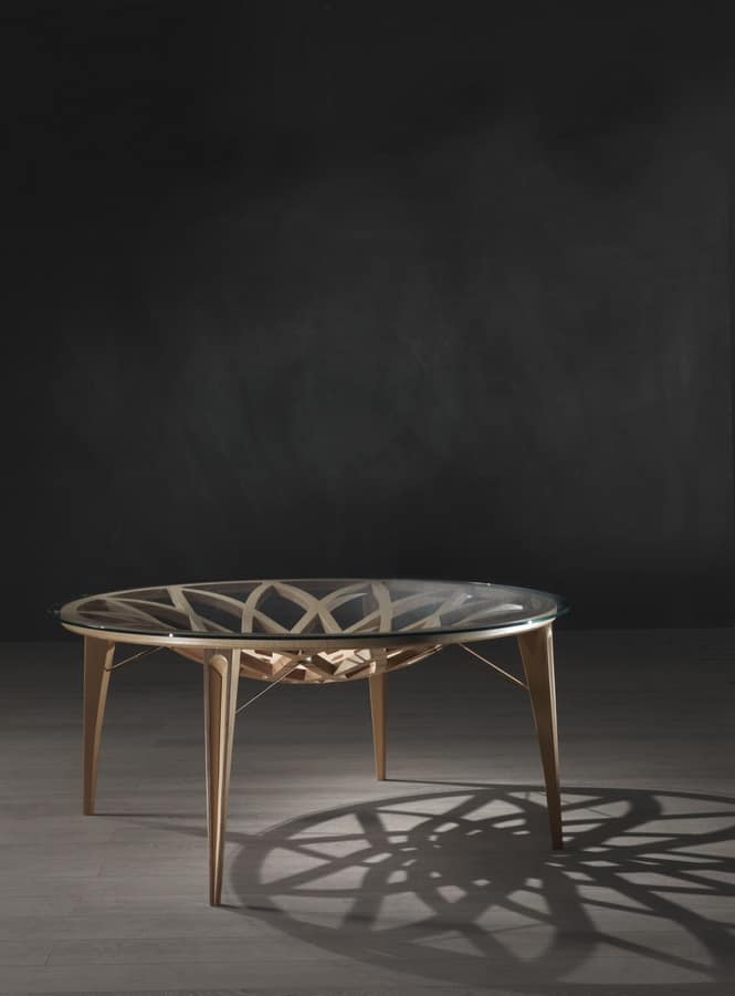"Galileo" Tisch in Holz geschnitzt, mit runder Platte in Klarglas, in einem modernen Stil, ideal für Hotels und Wohnnutzung.