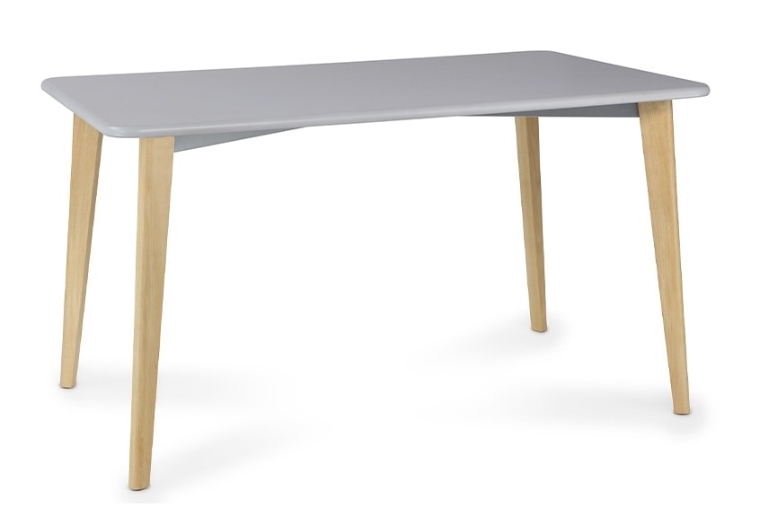 Tisch mit Beinen aus massivem Buchenholz und Stützen aus lackiertem Stahl.