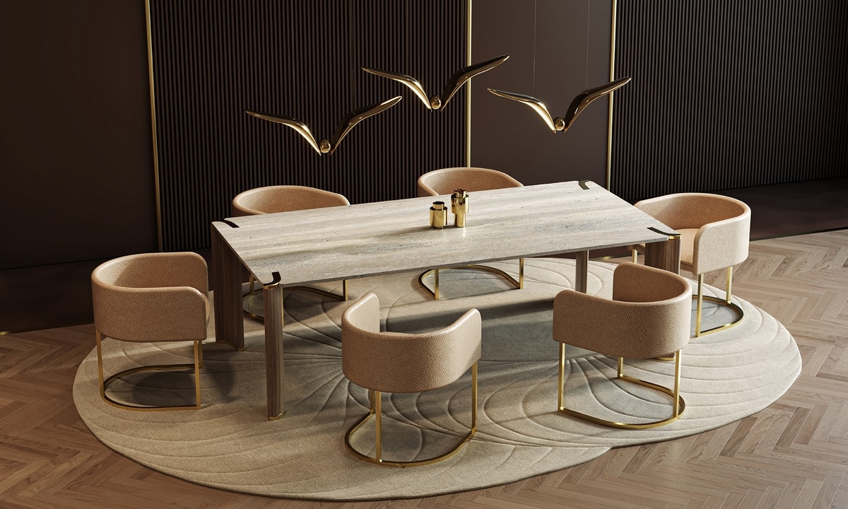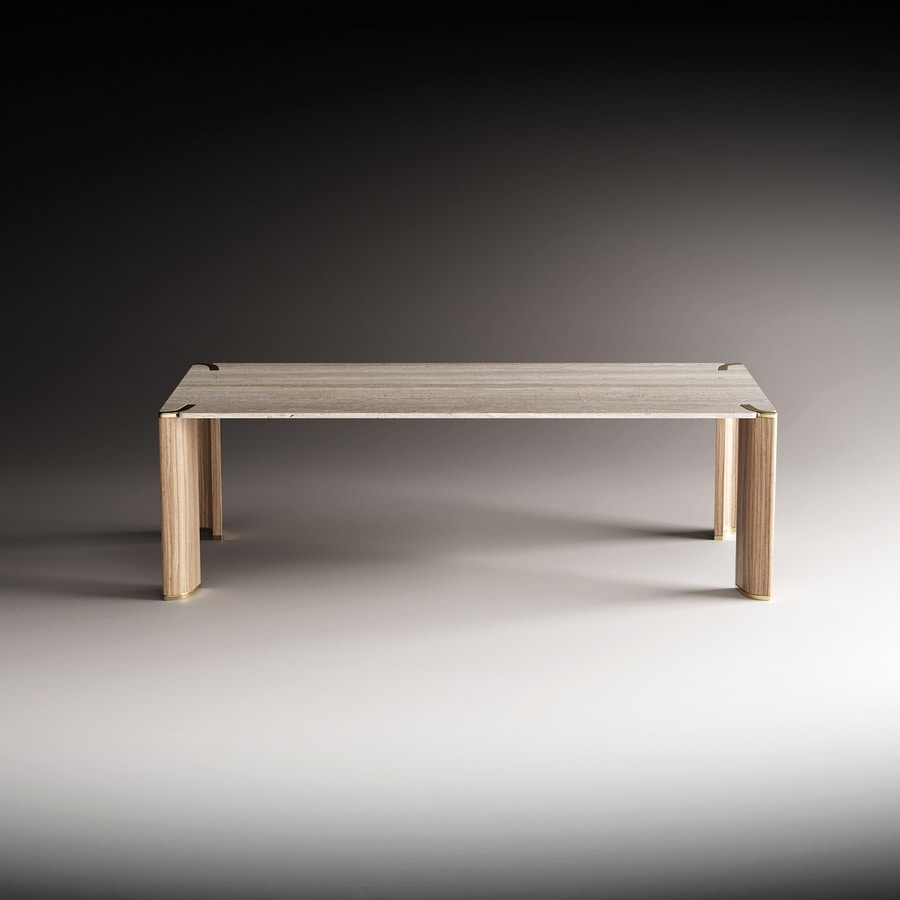 Der Horus-Tisch wurde rund um die Rundungen der Beine konzipiert. Wie ein fließender Fluss, der mit seinem Schlag die Felsen erodiert, wurde die Steinplatte des Tisches so geformt, dass sie die metallischen Details der Beine aufnimmt.
