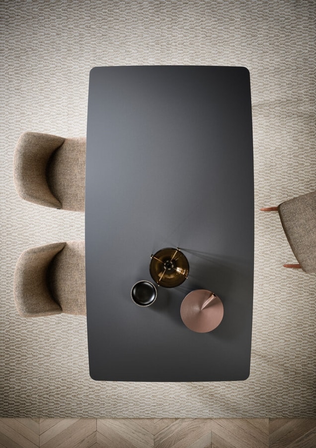 Es ist die Eleganz dieses Objekts, das schlichte und großzügige Formen mit dem diskreten Coup de Théâtre des Designs nachbildet, das durch die zur Mitte der Tischplatte hin gedrehten Beine entsteht.