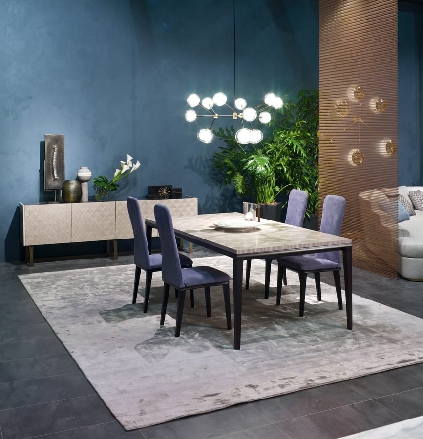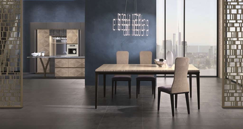 Tisch mit einer wertvollen Intarsienflachplatte mit einer geometrischen Dekoration, die durch die Kombination von vier verschiedenen Arten von raffiniertem Holz realisiert wurde: leichtes Sycomoro Frisé, Tay, Eucalipto Frisé und Pama. Beine in dunkel gebeiztem Holz.