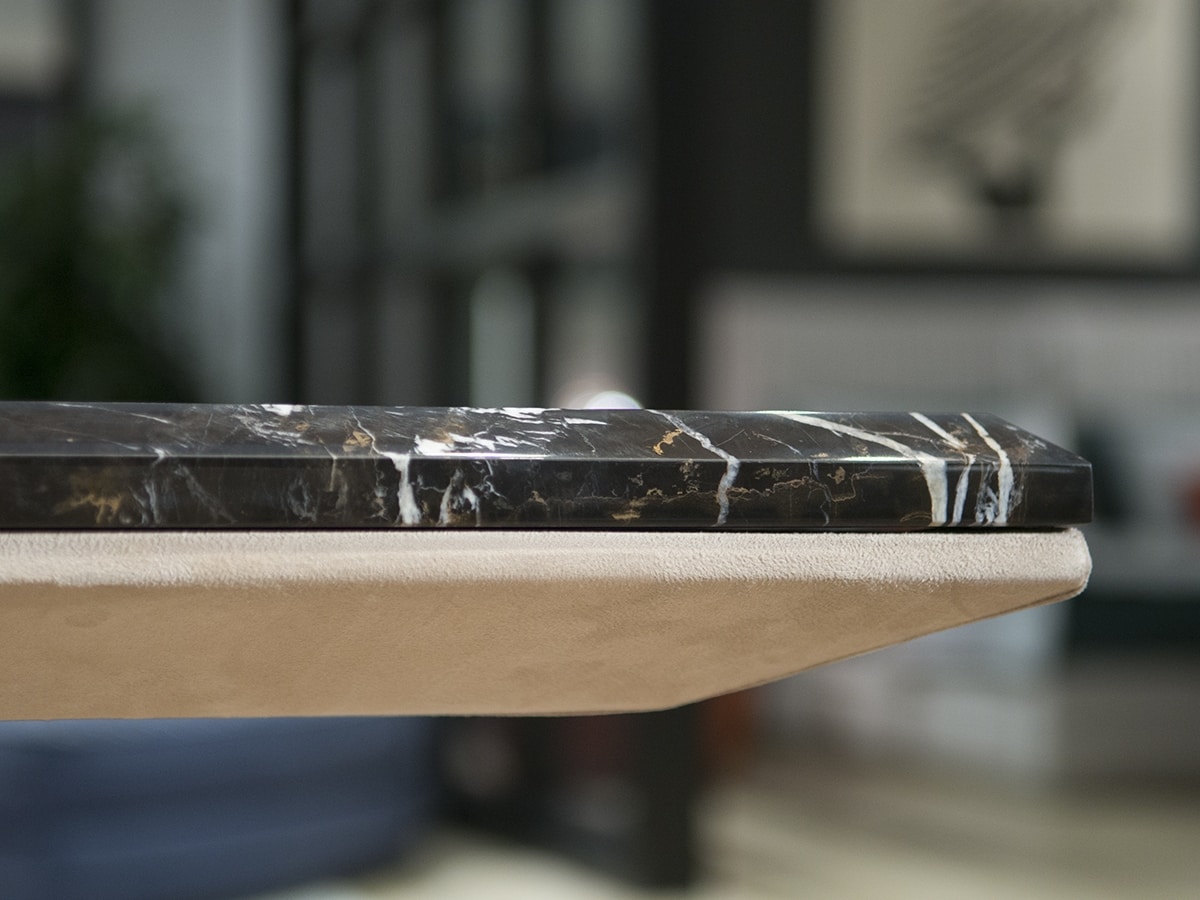 Abgeschrägte Marmorplatte Dicke 20 oder 30 mm, bronzierter oder Rauchspiegel, abgeschrägtes lackiertes Glas oder Holz.
