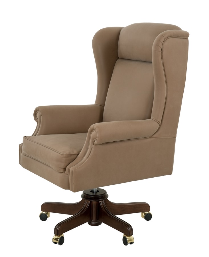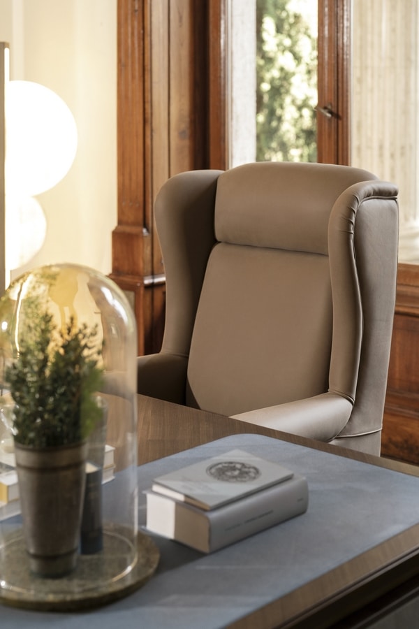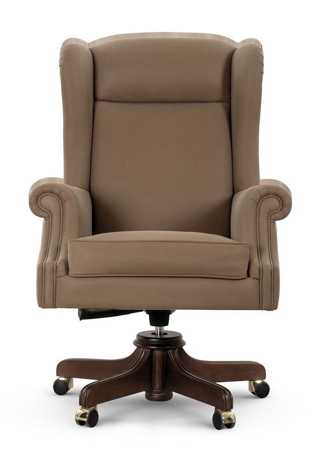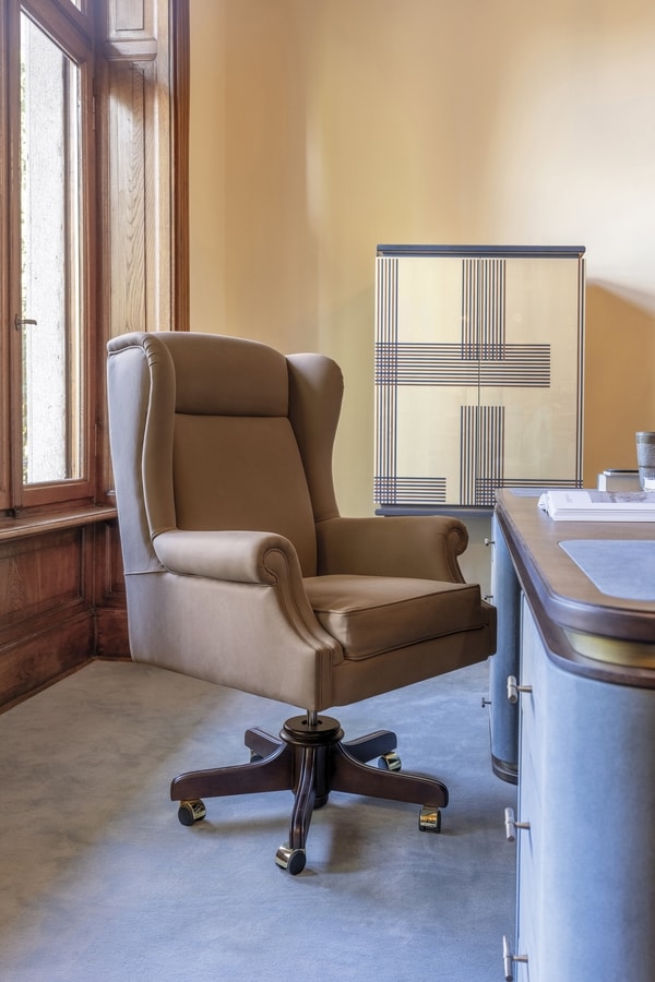 Büro-Sessel mit einem klassischen Stil, vollständig mit Leder bedeckt und mit eleganten Armlehnen verschönert. Die Struktur wird durch eine massive, in Walnuss -dyed -Holzbasis abgeschlossen, die mit Rädern ausgestattet und mit undurchsichtigem Malerei für einen nüchternen und raffinierten Effekt fertiggestellt wird. Eine Sitzung, die Komfort und Autorität in repräsentativen Umgebungen kombinieren soll.