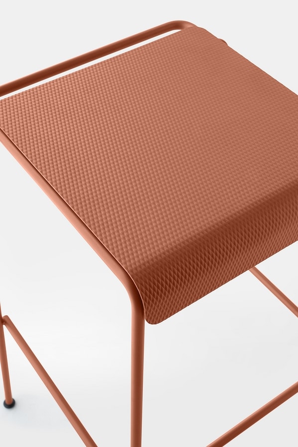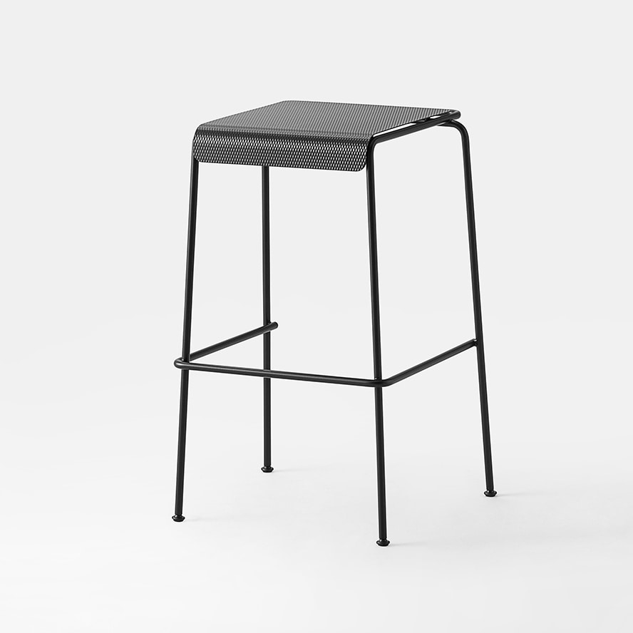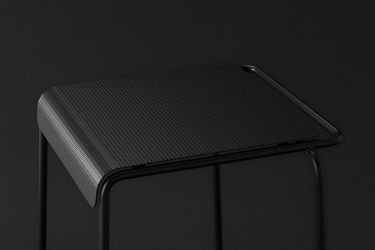 Die Sitzfläche, gefertigt aus texturiertem und lackiertem Edelstahlblech, überrascht mit einer Oberfläche, die an Stoff erinnert – eine taktile und visuelle Einladung, Platz zu nehmen, zu berühren und zu entdecken.