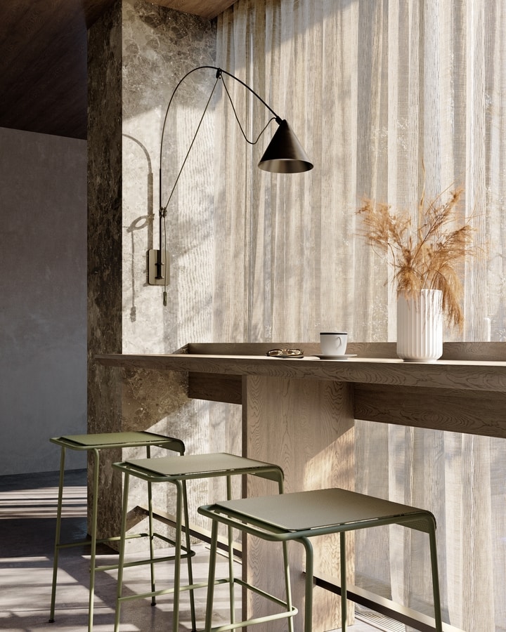 Das Gestell, geprägt von klaren geometrischen Linien, zeichnet eine zurückhaltende, aber markante Präsenz. Eine harmonische Synthese, die sich mühelos in Contract- oder Wohnräume einfügt – dort, wo Design zur Erzählung wird und jedes Detail eine Geschichte von Ausgewogenheit, Suche und Schönheit erzählt.