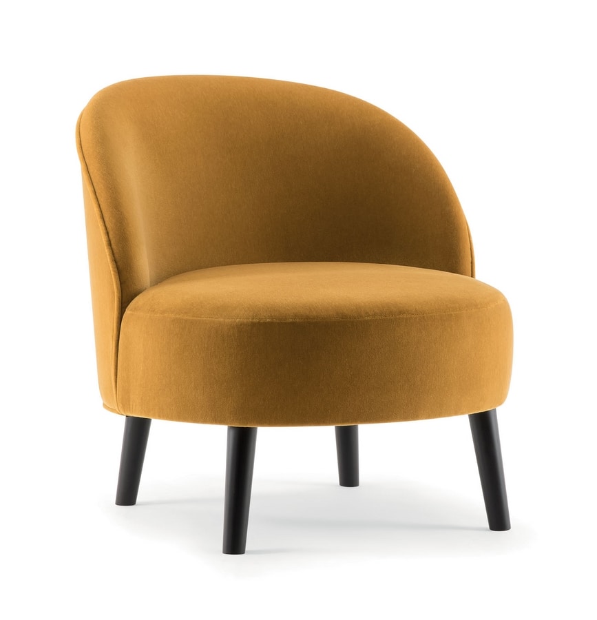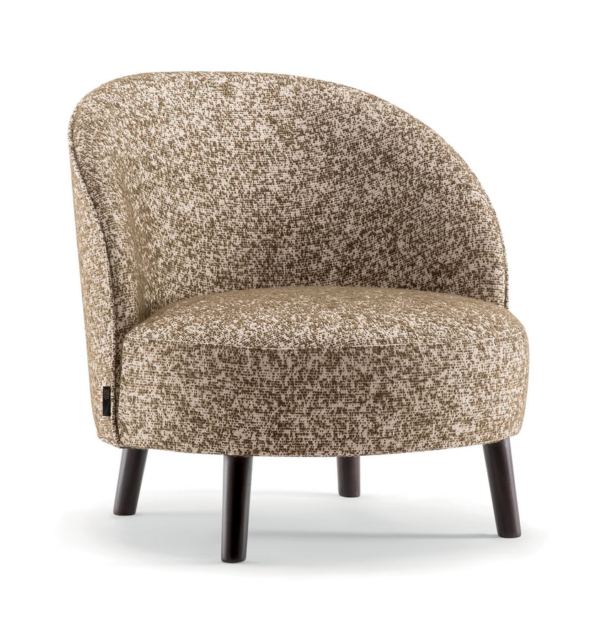 Ein perfekt runder Sitz und eine geschwungene Rückenlehne treffen sich an einer subtilen Naht, während vier robuste konische Massivholzbeine diesen Stuhl auf dem Boden halten. Der Ginger Loungesessel ist eine perfekte Lösung für Hotels mit hohem Standard, gemütliche Lounges und charmante Umgebungen. Die große Auswahl an Stoffen und Holzbeizen ermöglicht es, dieses Produkt individuell anzupassen und an jeden Raum anzupassen.