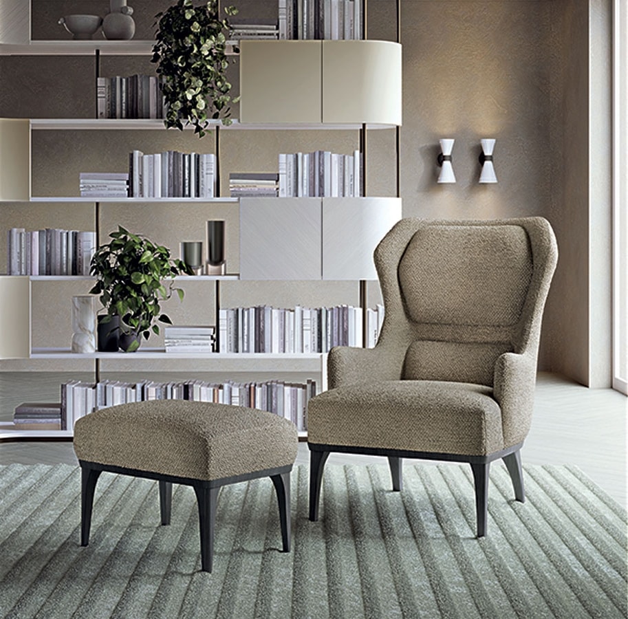 aus Massivholz in dunklem Tay-Ton, auch in Canaletta-Walnuss-Ton erhältlich. In Kombination mit gepolstertem Pouf Ara. Polsterung in verschiedenen Stoffen, Ledern und Nubuk erhältlich.