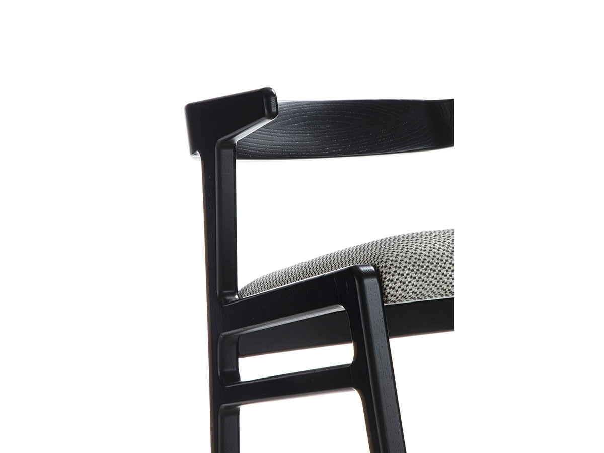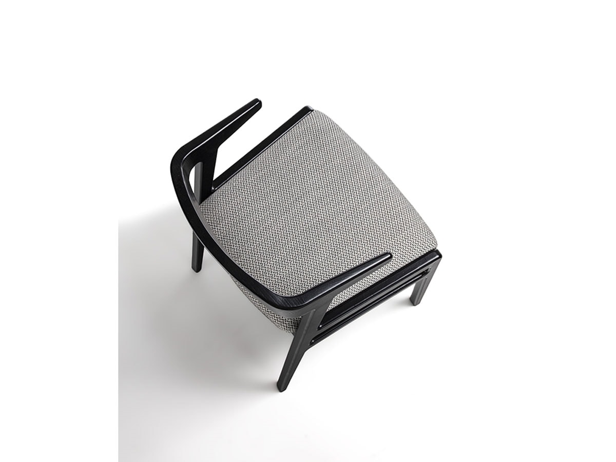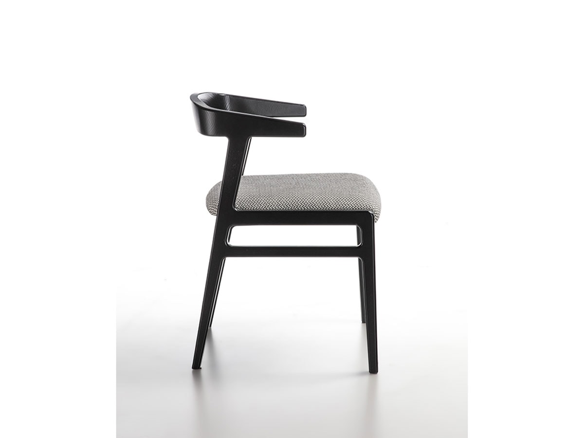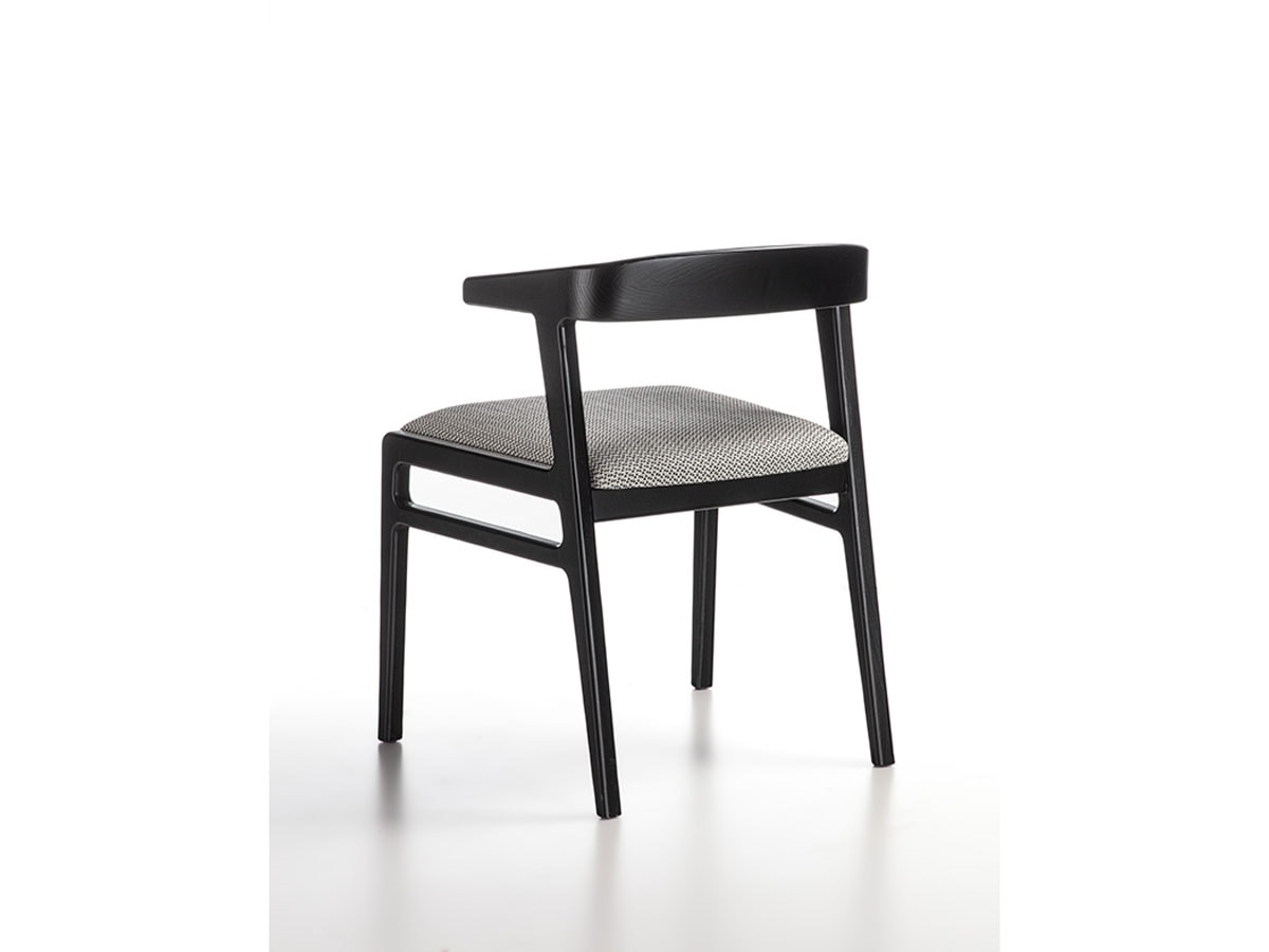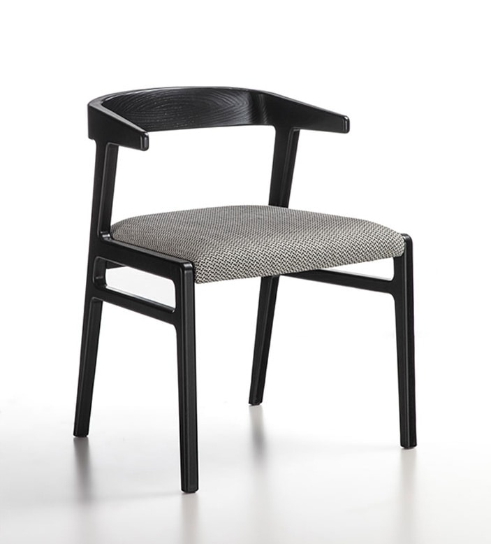 Kleiner Sessel aus Massivholz mit schlichtem und leichtem Design. Zurück mit abgerundeter und umhüllender Form. Erhältlich in Canaletta-Walnuss oder Schwarz mit Sitzpolsterung aus Stoff, Leder oder Nubuk.
