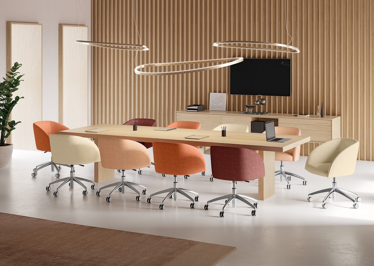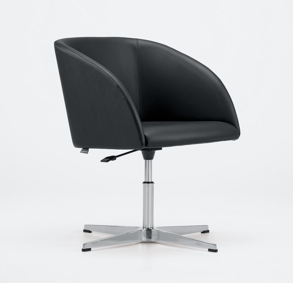• Fünfspeichenfuß aus poliertem Aluminium mit Rollen oder Füßen. Die selbstbremsenden Lenkrollen sind aus Nylon für weiche Böden oder mit weichem Polyurethan-Laufbelag für harte Böden. Die festen Füße bestehen aus verstärktem Nylon.