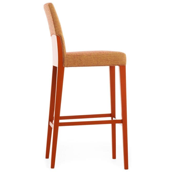 Barhocker mit Gestell aus Massivholz. Rücken hinten aus Sperrholz. Sitz und Rücken gepolstert mit Kederdetail am Sitz und Rücken.