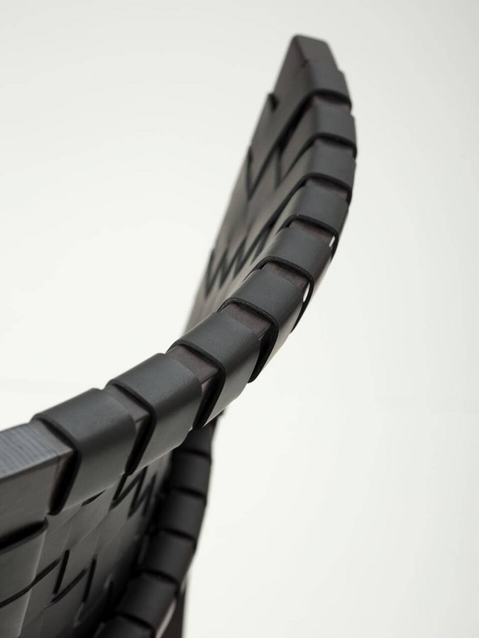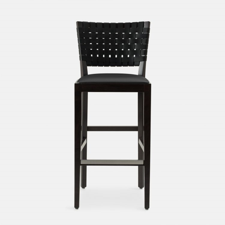Der Hocker der Chicago-Kollektion zeichnet sich durch seine moderne, klassische Form aus, die durch die charakteristische Rückenlehne aus handgeflochtenem Leder verschönert wird.
