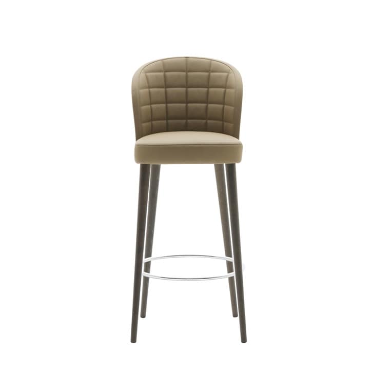 Hocker, Schale im Schaum. Gürtel Sitz. Gepolstert auf dem Rahmen. Polsterung der Rückenlehne in Rechtecken gesteppt. Mit vier gedrehten Beinen aus Massivholz und Chrom Kreis Fußstütze.