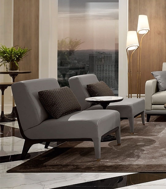 Dieser Sessel strahlt mit seiner schlanken und funktionalen Silhouette, die durch einen großzügigen Sitz und eine leicht geneigte Rückenlehne gekennzeichnet ist, moderne Raffinesse aus und bietet extremen Komfort und Entspannung. Dieser Sessel ruht auf einer schwarz lackierten Eschenstruktur, die mit weichem Polyurethanschaum gepolstert ist, und ist mit feinem grauem Leder bezogen. Das Teil wird mit einem kleinen Kissen (50 x 30 cm) geliefert, das mit Fasern und Federn gepolstert und mit abnehmbaren Stoffbezügen bezogen ist.