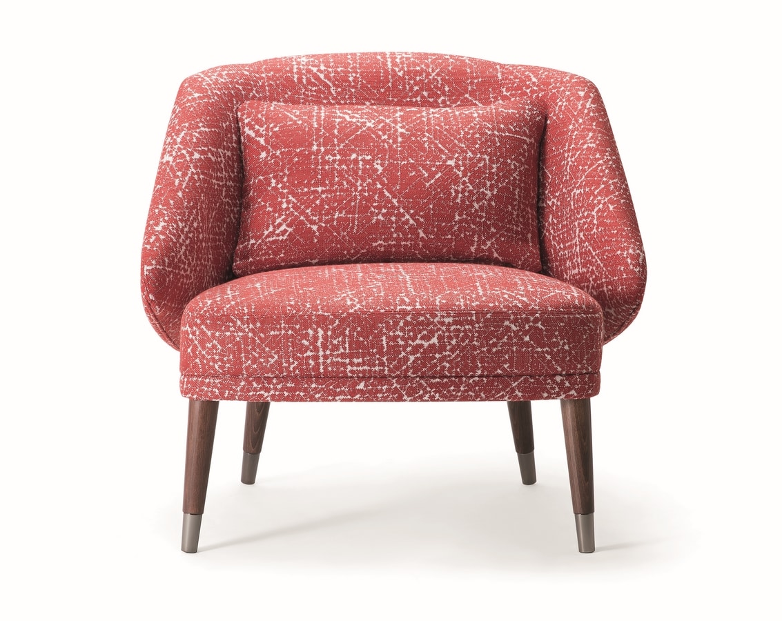 Bequeme und gemütliche Kollektion mit einer warmen und einladenden Persönlichkeit, die für jede Umgebung geeignet ist. Der Meg Lounge Chair besteht aus zwei Elementen, die hinten zusammenkommen. Der Sitz in einem quadratischen Profil ist bequem gepolstert und auf vier konischen Holzbeinen mit Metallschuhbechern angeordnet. Die Rückenlehne des Meg legt sich um den Sitz und schafft einen Stuhl, der ebenso bequem wie schrullig ist. Die große Auswahl an hochwertigen Stoffen und Holzbeizen macht diesen Loungesessel in hohem Maße anpassbar, um jedem Veranstaltungsort von seiner besten Seite zu entsprechen.