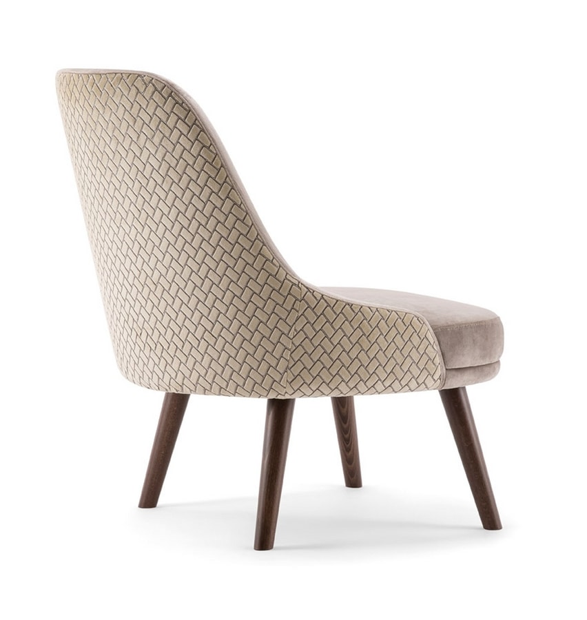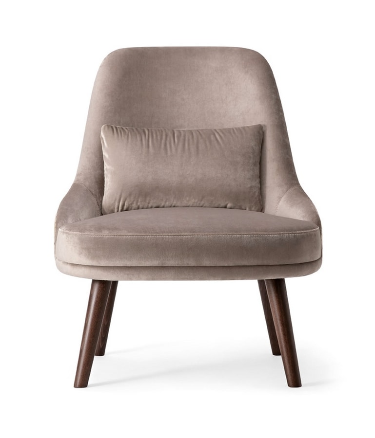 Bequemer und charmanter Loungesessel mit Massivholzbeinen und voll gepolstertem Sitz. Die hohe Rückenlehne ist seitlich geneigt, um den Benutzer in seinem tiefen Sitz zu wiegen. Das Kissen macht diesen Sitz noch angenehmer und reicher. Dank des riesigen Angebots an Stoffen und Holzbeizen konnte der Zoe Loungesessel individuell an jeden Innenraum angepasst werden.