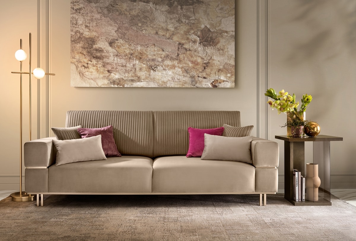 Preise anfordern Ähnliche ProdukteDie Sofas des Fiamma-Wohnbereichs stellen eine moderne Komfortzone dar, die durch weiche und dennoch geometrische Volumen definiert ist und Entspannung mit hochwertiger Ästhetik verbindet. Die Füße aus satiniertem Gold in der Farbe Champagner und die Metallprofile der Armlehnen greifen die Oberflächen des Wohnbereichs auf und schaffen einen visuellen Fil-Rouge zwischen den Räumen, der die anspruchsvollsten Innenarchitekturprojekte bereichert. Die Möglichkeit, die Polsterung aus dem breiten Adora-Stoffmuster auszuwählen, ermöglicht höchst individuelle Konfigurationen und verwandelt jedes Sofa in ein unverwechselbares, maßgeschneidertes Stück