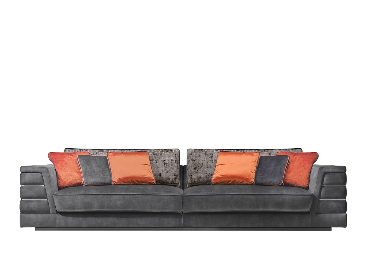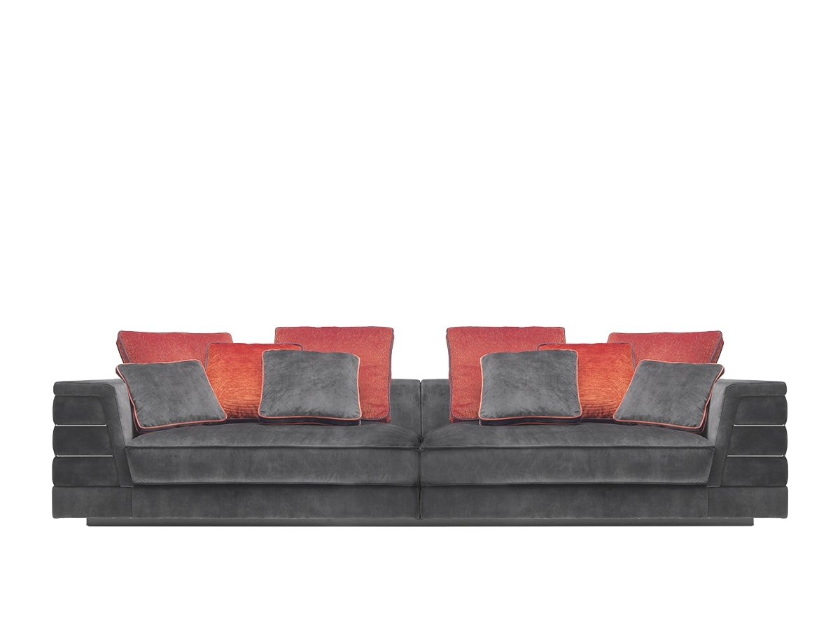 Sofa mit Massivholz und Mehrschichtstruktur. Sockel aus lackiertem MDF oder Metall. Dekorationen der verchromten Metallstruktur in den Ausführungen im Katalog. Sitz mit Stahlfedern und elastischen Gurten. Sitze aus Polyurethanschaum und Gänsedaunen. Rückenkissen aus Gänsedaunen und Silikonwatte. Strukturabdeckung nicht abnehmbar. Erhältlich in den Rückenlehnenvarianten SOFT (großes Rückenkissen als Sitzfläche) oder GLAMOUR (mehrere Rückenkissen in unterschiedlichen Größen).