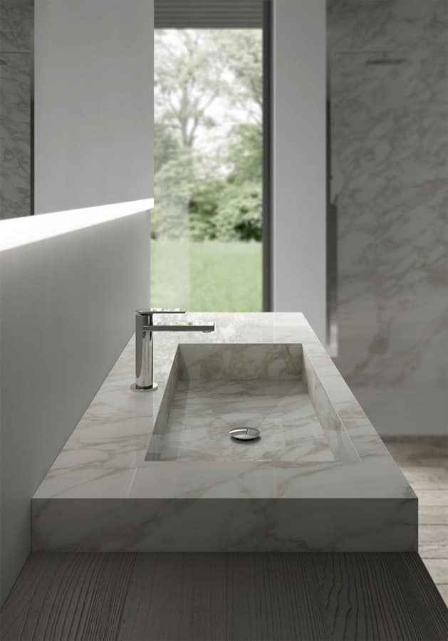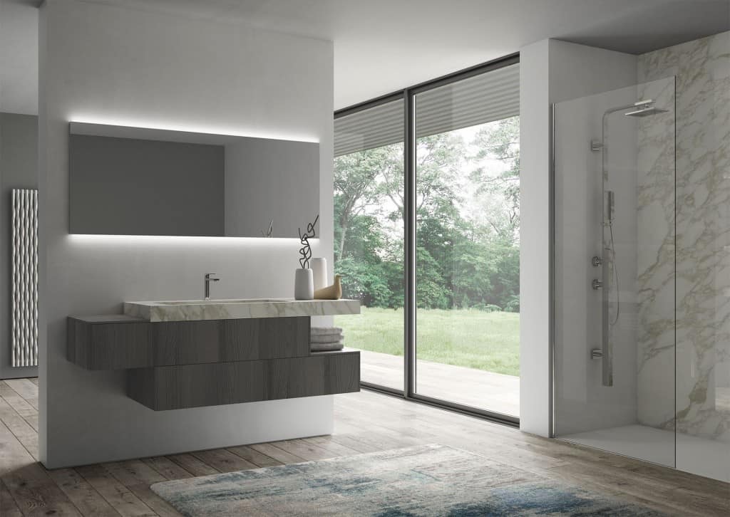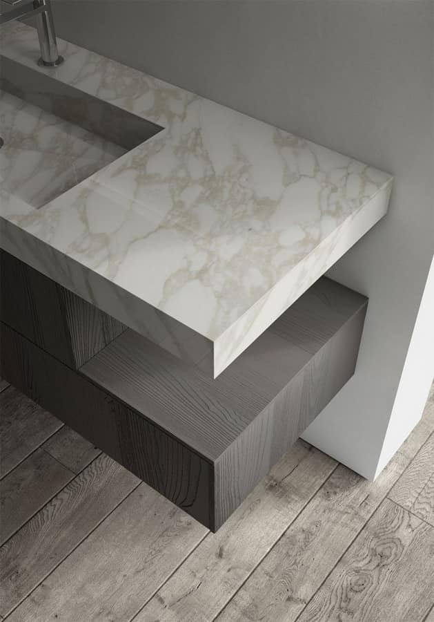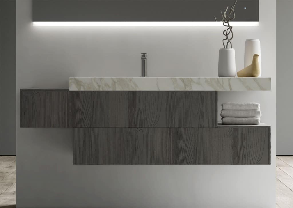 Unterschränke aus Teak Sabbiato Piombo. Abdeckplatte mit integriertem Waschbecken aus Steinzeug Calacatta. Spiegel “Dual”.