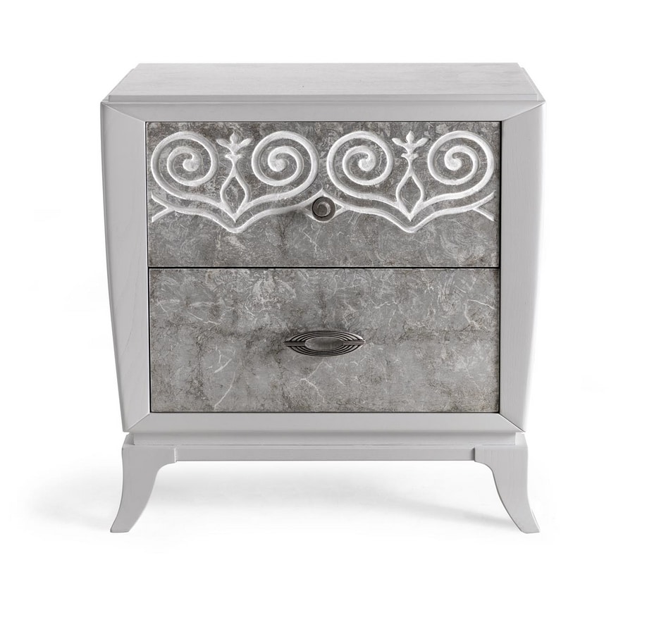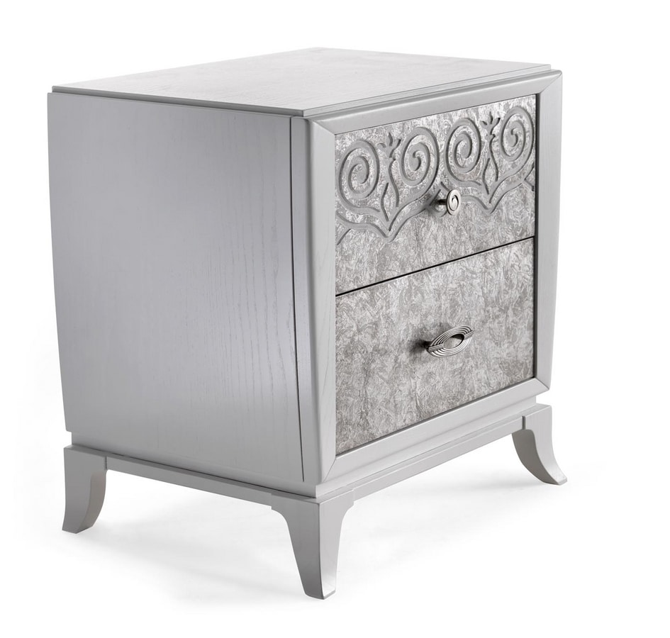 Nachttisch 2 Schubladen mit Füßen. Struktur aus weiß lackierter Esche, Fronten aus weißem Silber.