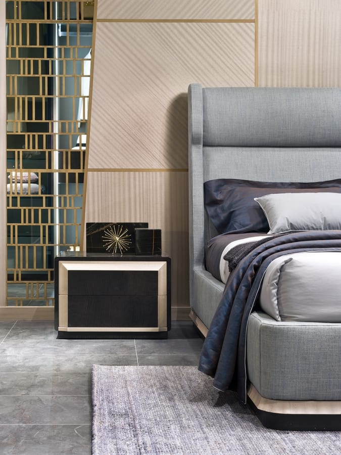 Eleganter Nachttisch mit Schubladen und Struktur aus Sycomoro-Holz, verziert mit einem umlaufenden skulpturalen Band aus Pamaholz.