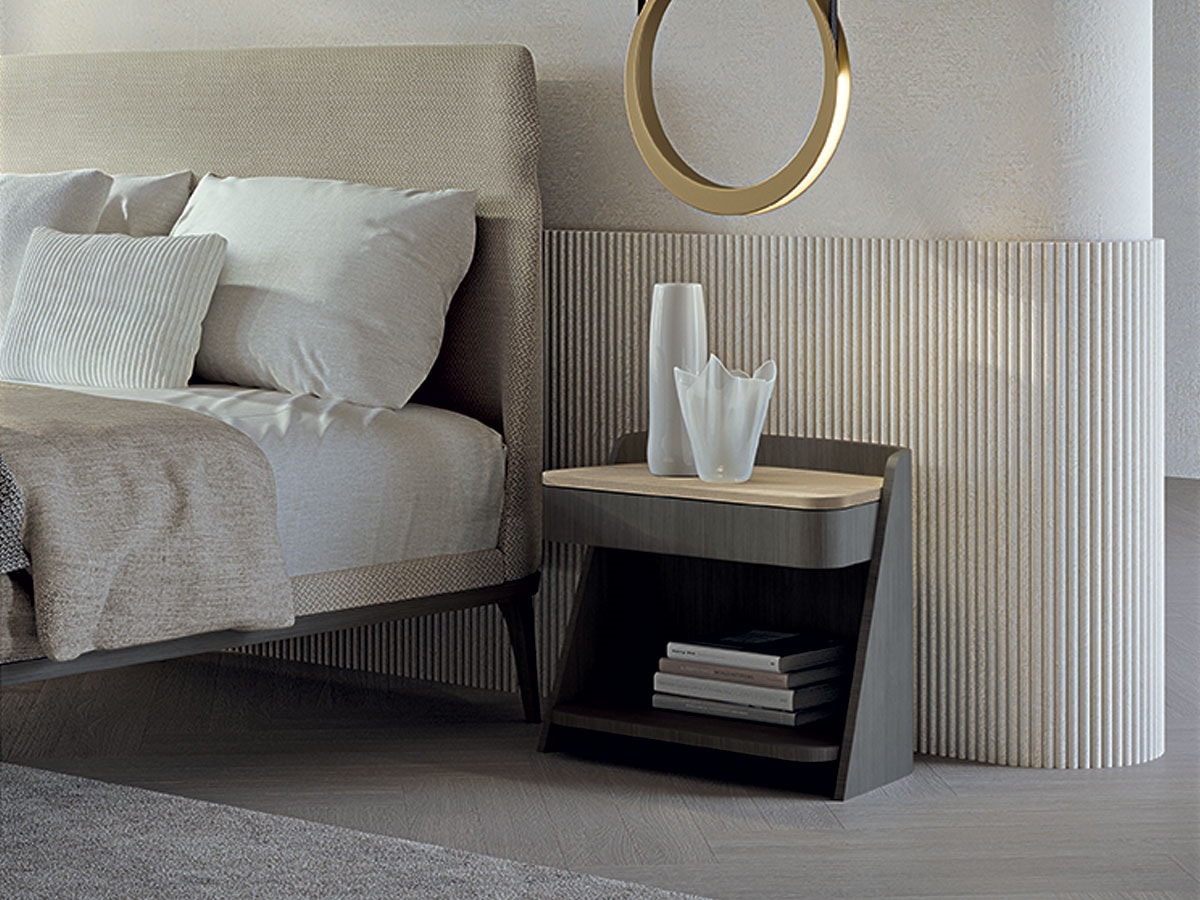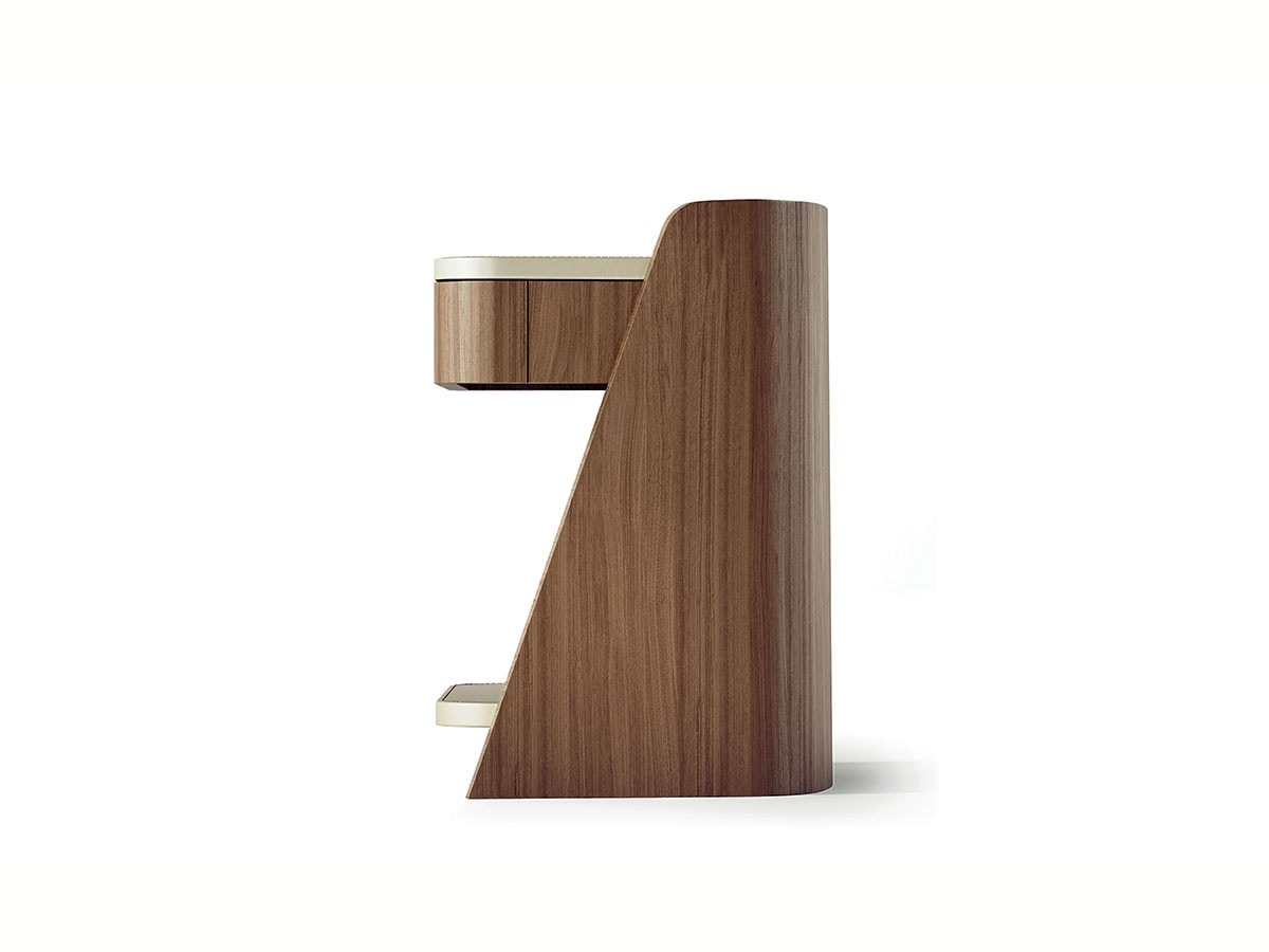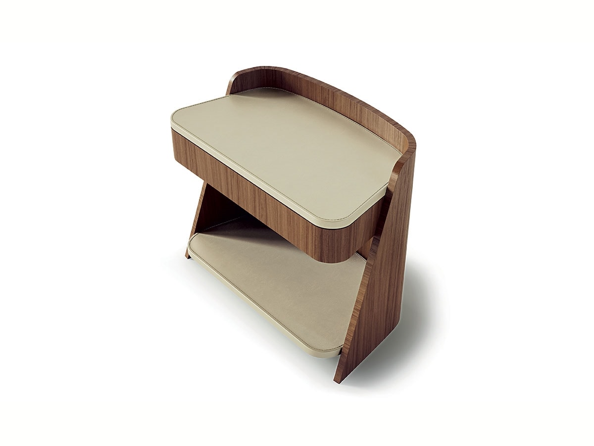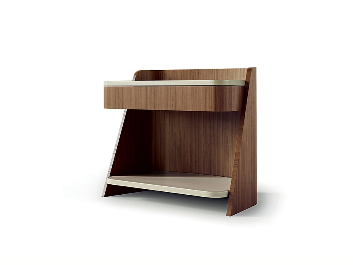 Nachttisch abgestimmt auf die Linie Shape, bezogen mit Nussbaum Canaletta (CD34) oder dunklem Tay (CD34B). Ausgestattet mit Push-and-Pull-Schublade und Slow-Motion-System. Platte und Ablage aus Leder in verschiedenen Farben erhältlich.