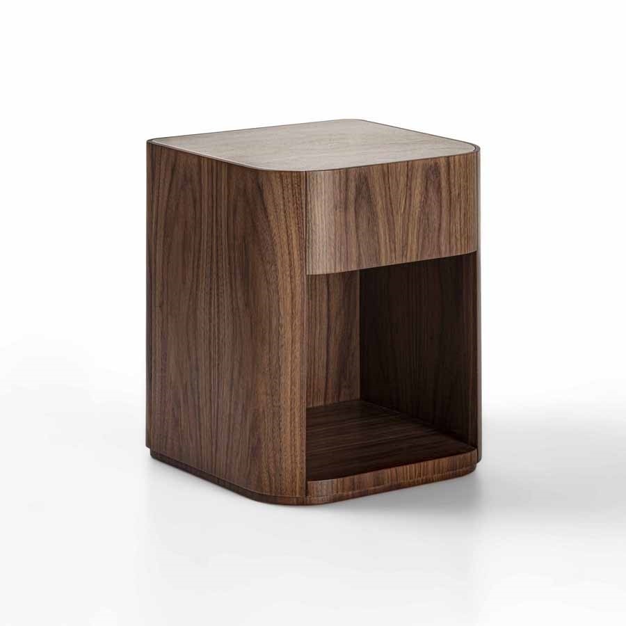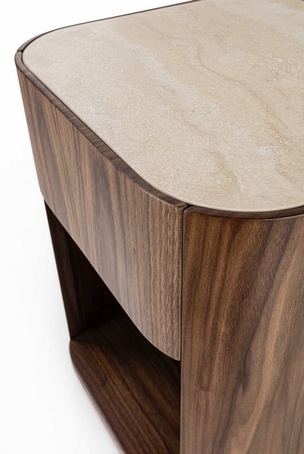 Nachttisch mit einer einfachen und abgerundeten Linie, präsentiert in Nussbaum Canaletta F105 und verziert mit einer matten Travertino-Marmorplatte. Es verfügt über ein Regal und eine Schublade mit Rollsystem.
