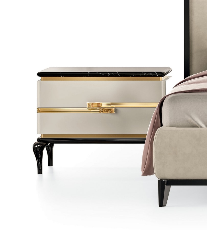 Preise anfordern Ähnliche ProdukteNachttisch mit Struktur aus Sperrholz und glänzend lackiertem MDF, Rahmen und Sockel aus glänzend schwarz lackiertem Holz. Schubladen mit Blum-Führungen ausgestattet. Griffe und Profile aus glänzend goldfarbenem Metall.