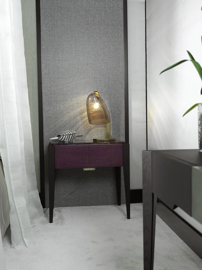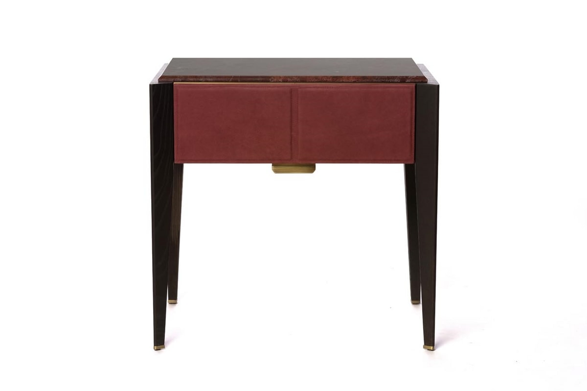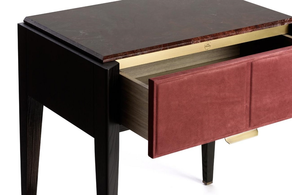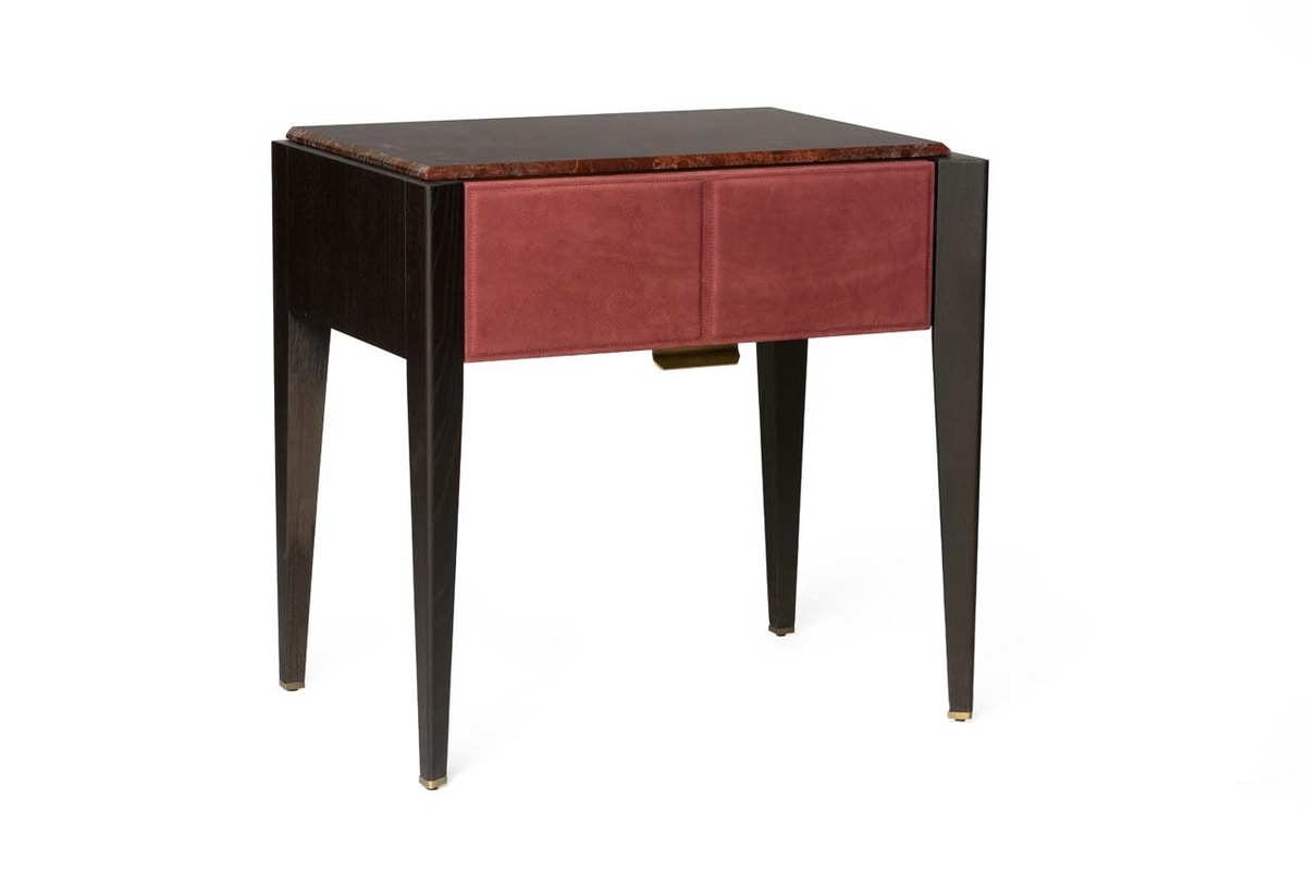 Nachttisch mit lederbezogener Schublade. Der Lepanto Nachttisch besteht aus furniertem Sperrholz mit Teilen aus massiver Esche in einem urbanen Schwarz, wie die Kommode. Die vielen Details machen ihn zu einem hochwertigen und hochwertigen Möbel: Nubukleder für Schublade, Griff und Ende Füße aus Messing, Oberfläche aus hellbronze, Oberseite aus rotem Lepanto-Marmor. Es kann auch in verschiedenen Hölzern, Oberflächen und mit verschiedenen Beschichtungen und Marmoren hergestellt werden.