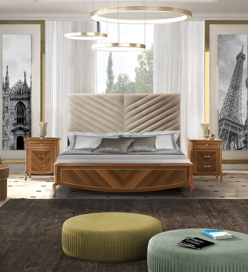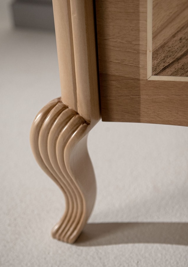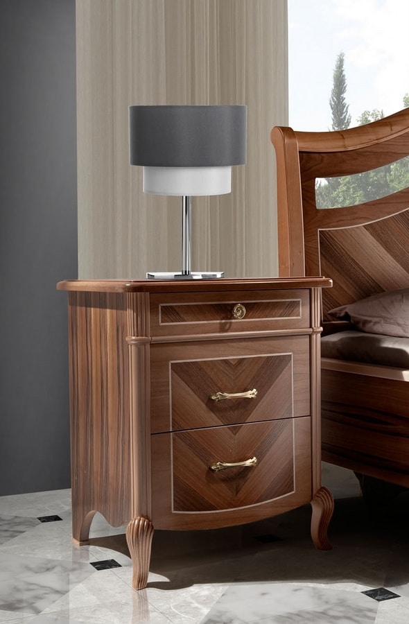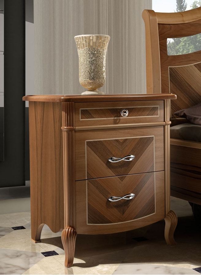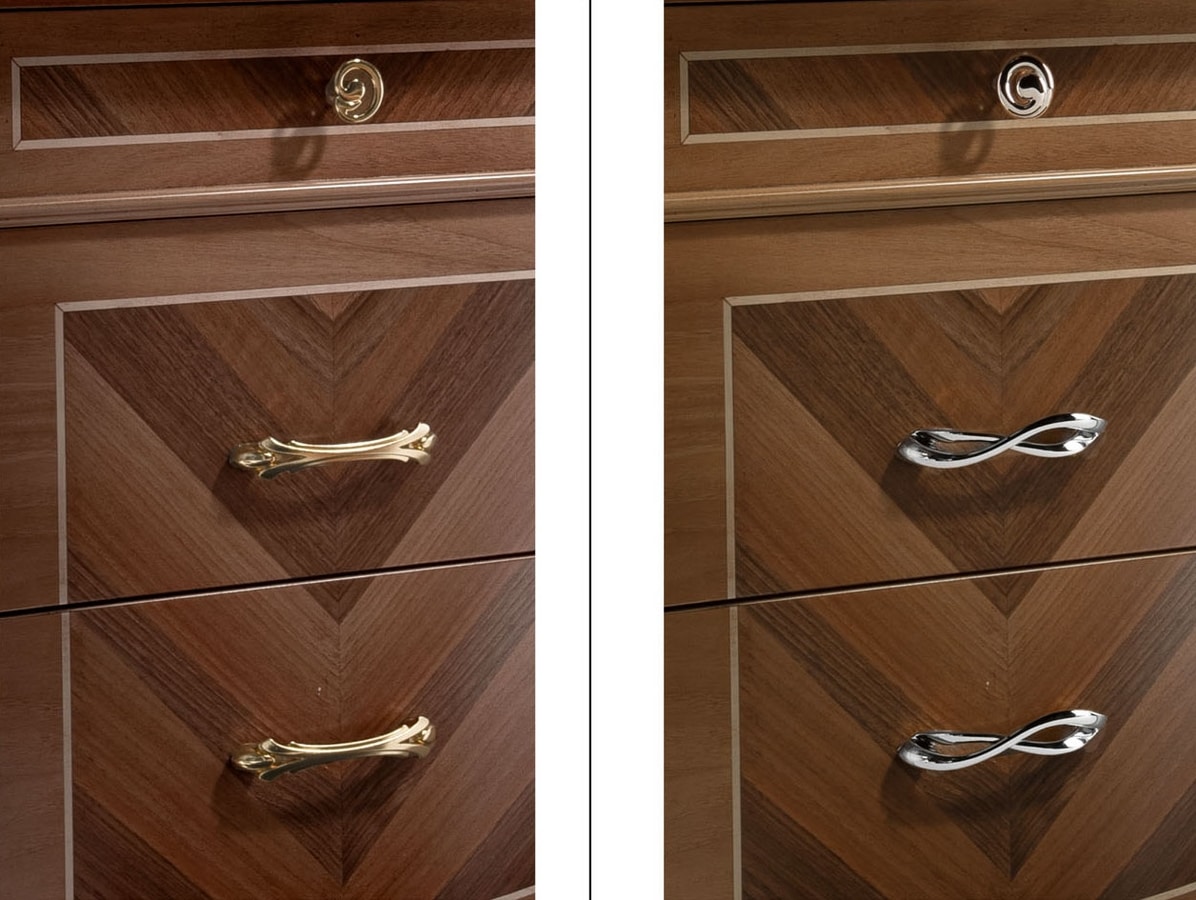 Nachttisch aus echtem Walnussholz mit Handwerkskunst und Einlagen, die diese Kollektion wertvoll und einzigartig machen. Erhältlich in 3 Walnussfarben, angereichert mit Blattgold- oder Silberblattdetails. Griffe aus poliertem Messing oder poliertem Chrom.