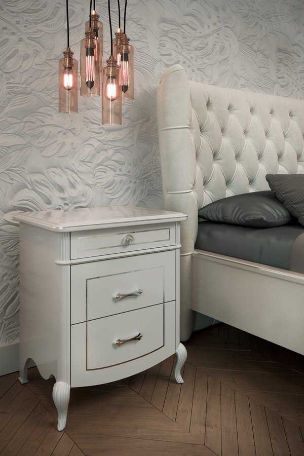 Nachttisch aus weiß lackiertem Holz mit Handwerkskunst. Details in Blattgold oder Silber. Griffe aus poliertem Messing oder poliertem Chrom.