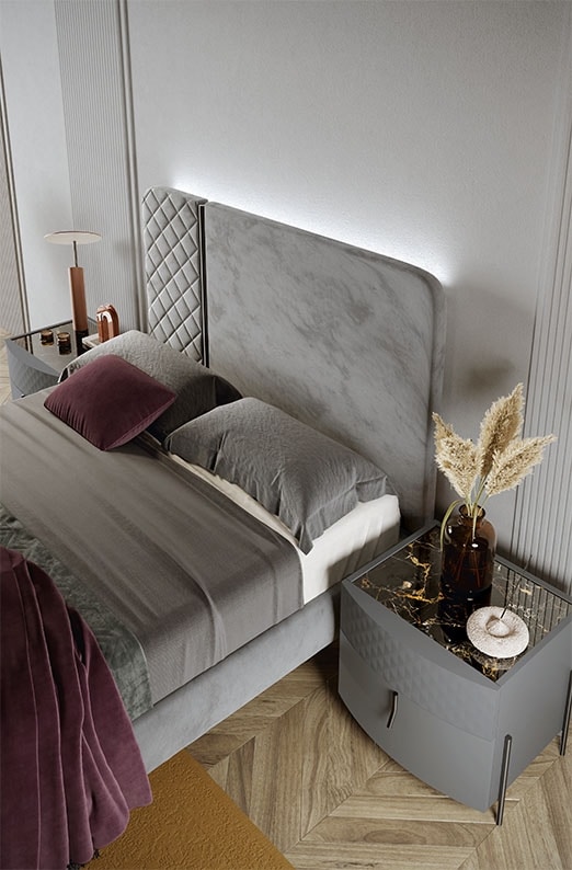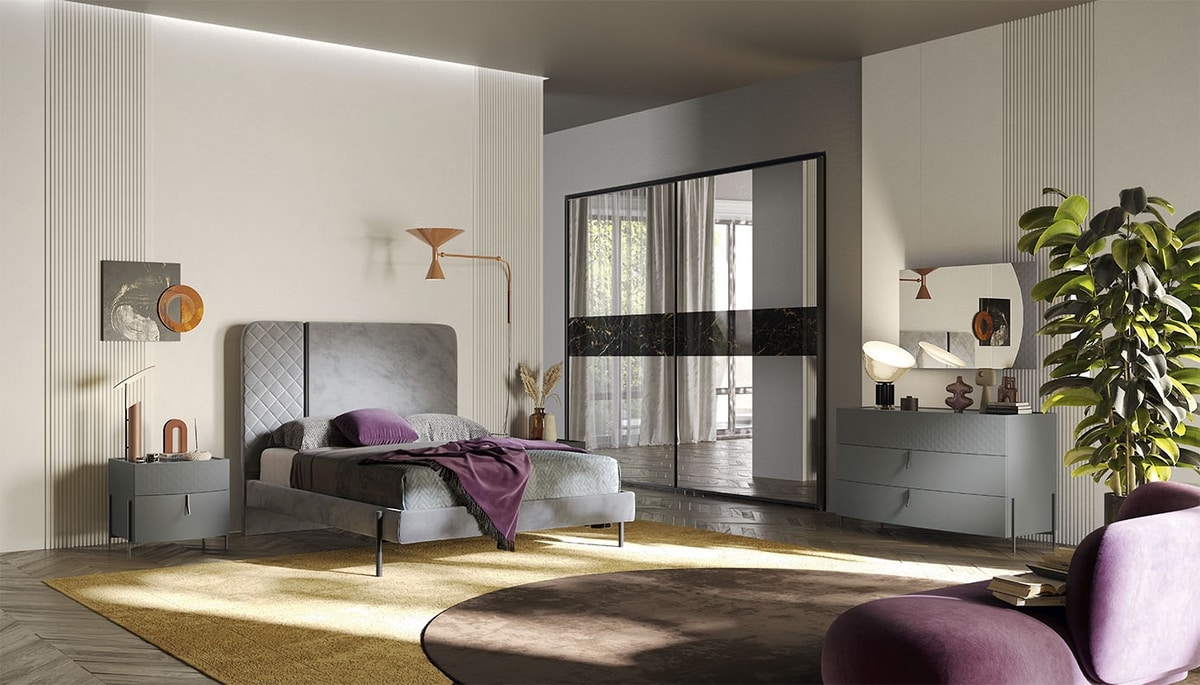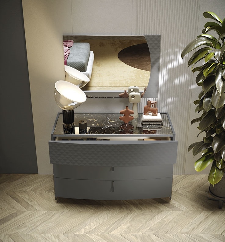 Moderne Kommode und Nachttische in Titanfarbe, mit Portoro-Marmorplatte.
