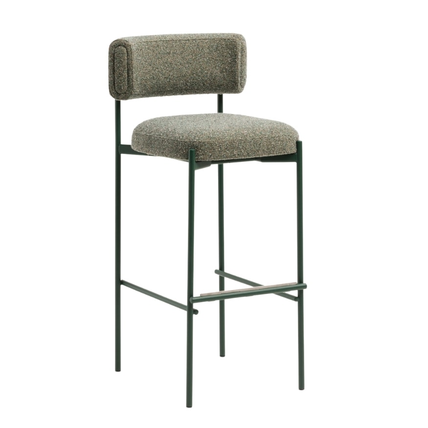 Es besteht die Möglichkeit, den Hocker mit einem anderen Stoff oder einer anderen Farbe zwischen Sitz und Rückenlehne zu personalisieren oder einen kontrastierenden Stoff oder eine andere Farbe für den vorderen Einsatz der Rückenlehne zu wählen.