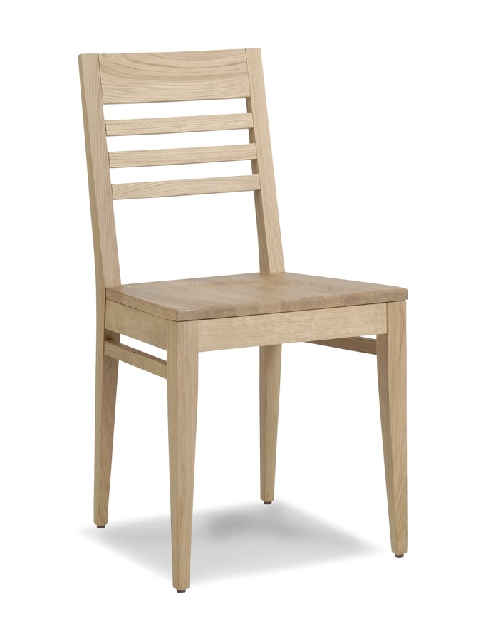 Eichenholzstuhl mit festem Holzsitz, der für Vertrags- und Wohnumgebungen geeignet ist. Auch mit gepolstertem Sitz erhältlich.
