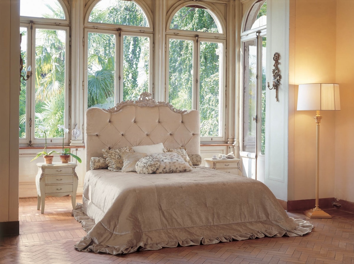 Bett mit gepolstertem Kopfteil, mit Capitonné-Herstellung. Verziert mit einer Schnitzerei im oberen Teil.