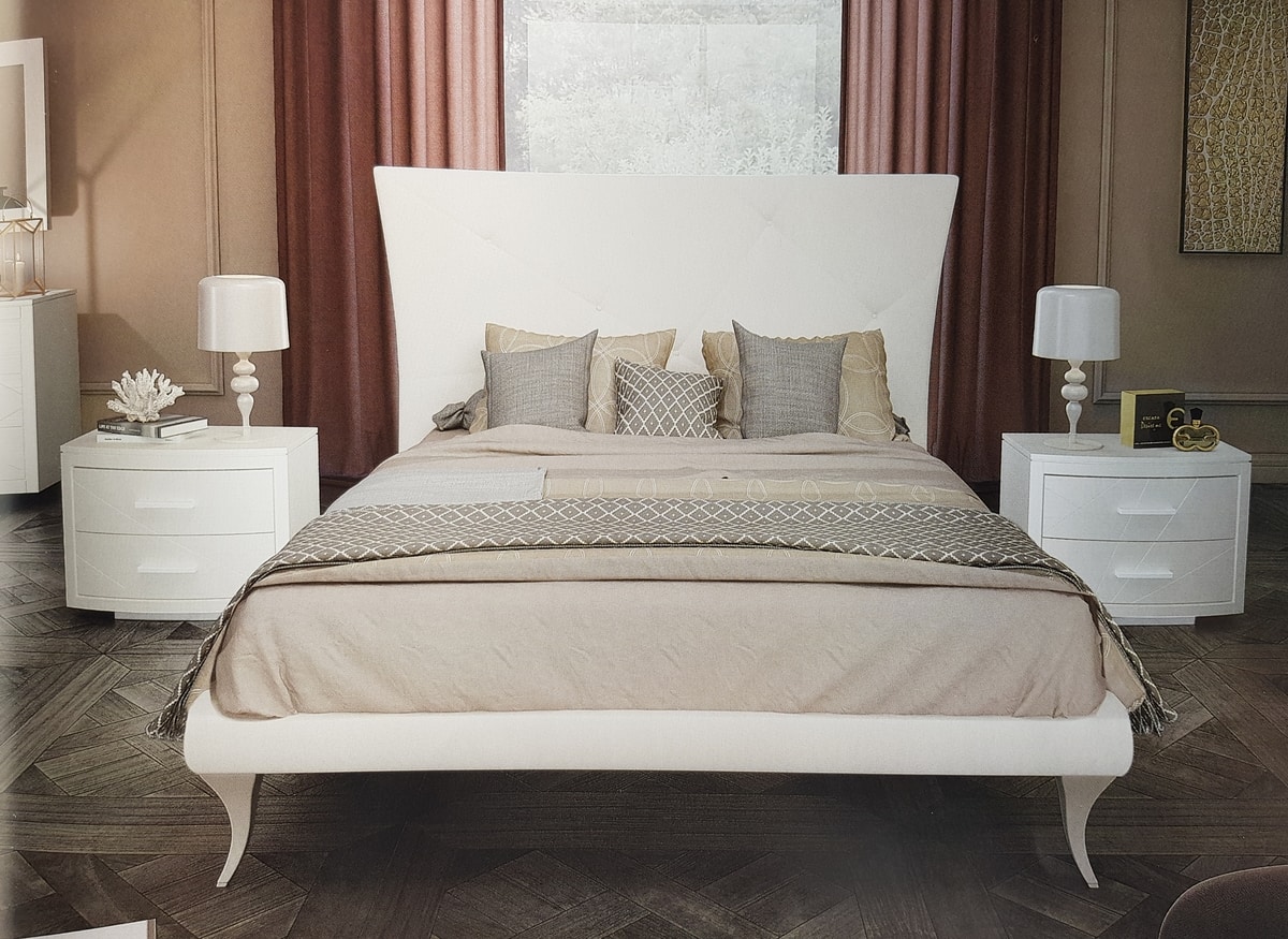 Bett mit gestepptem Kopfteil aus Kunstleder, Bettgestell immer in lackierten Füßen aus Kunstleder. Möglichkeit der Container-Box.