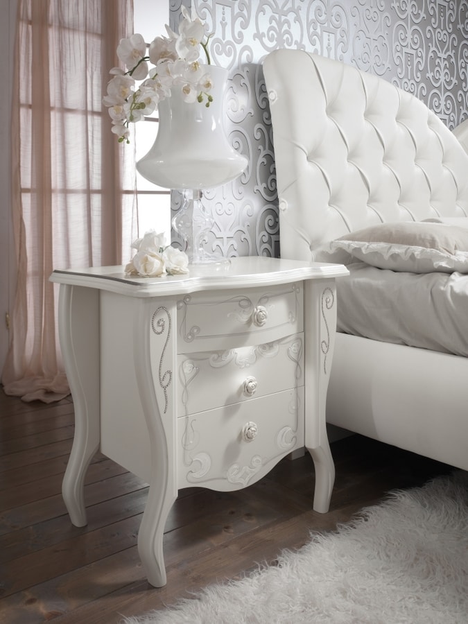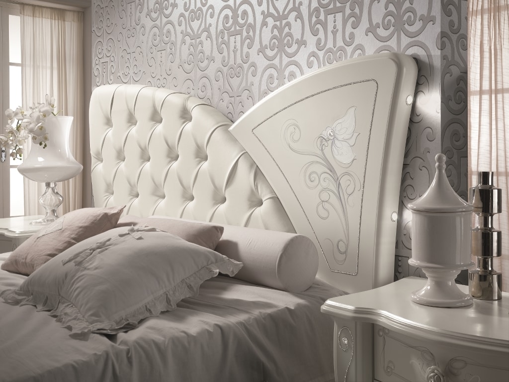Bett-Mod. Chloè mattweiß lackierter Quader mit handgefertigter Dekoration. Gepolstertes geknöpftes Loch aus weißem Kunstleder mit Swarovski-Einsätzen. LED-Leuchten auf der Außenseite. Hoher gepolsterter Bettrahmen mit Behälter und Netz inklusive.