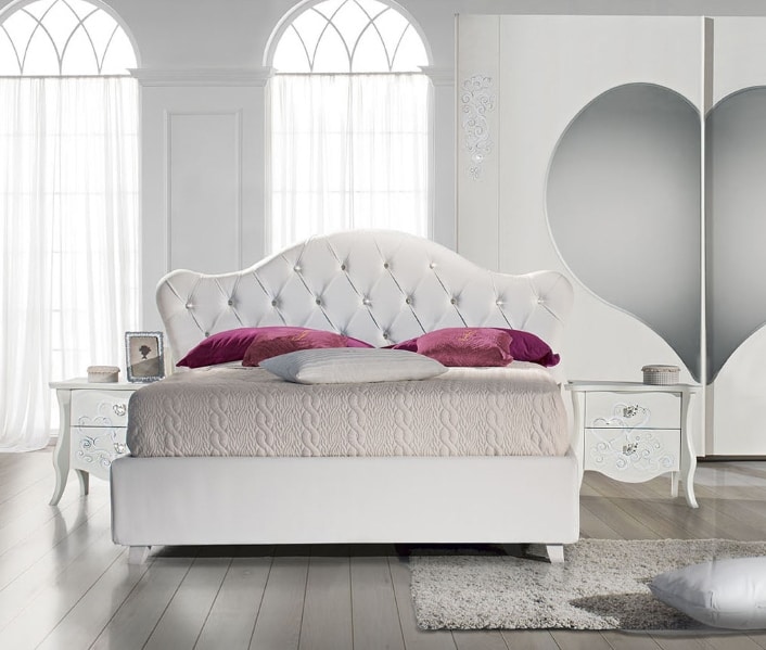 Das Polsterbett Ilary passt sehr gut in den Kontext des romantischen Schlafzimmers, passt sich aber gleichzeitig jeder Einrichtung an, da es sich um ein gepolstertes Öko-Leder handelt, das mit Swarovski-Kristallen angereichert ist.