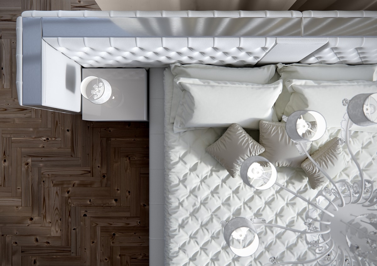 Prächtige gepolsterte Struktur auf diesem modernen Bett mit starken gespannten Linien, weich gemacht durch Stoff- oder Lederpolsterung mit handgearbeiteten Capitonne- und Metallblättern.