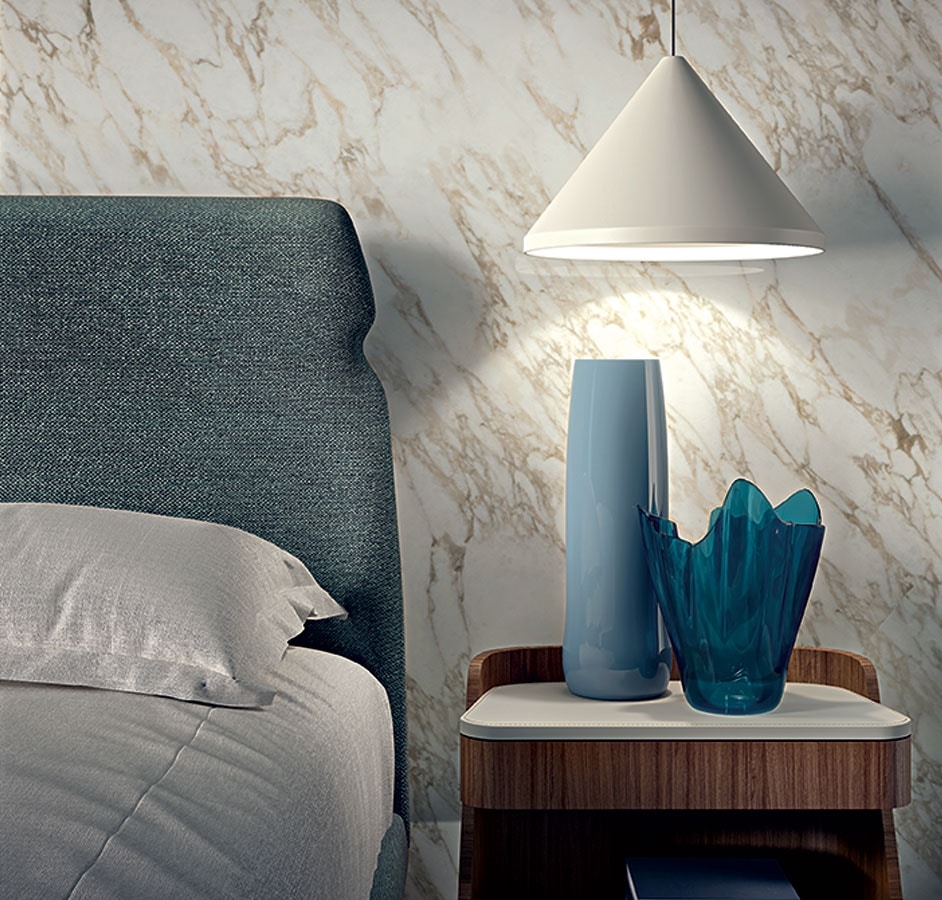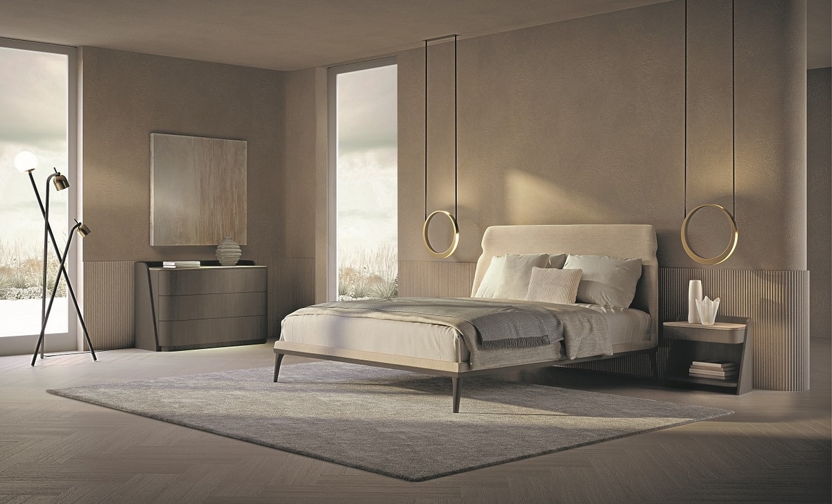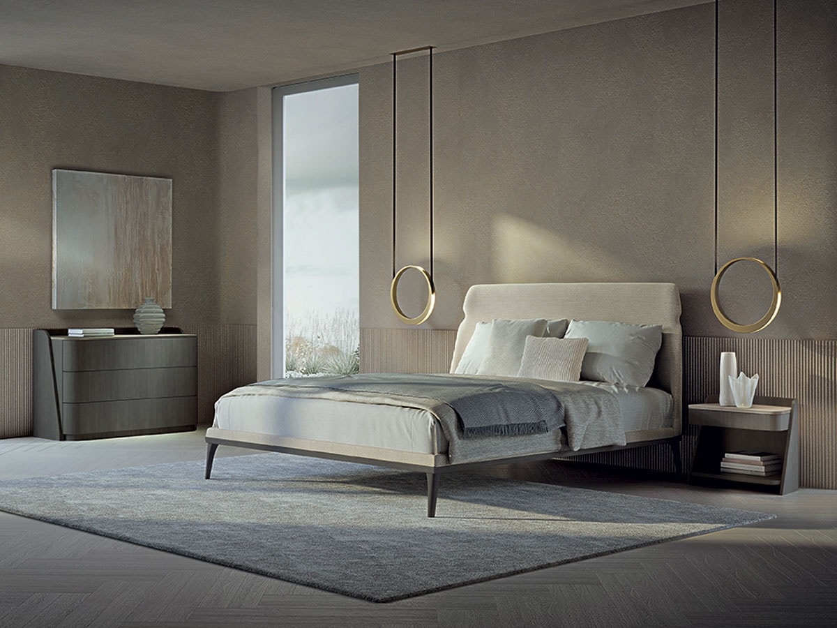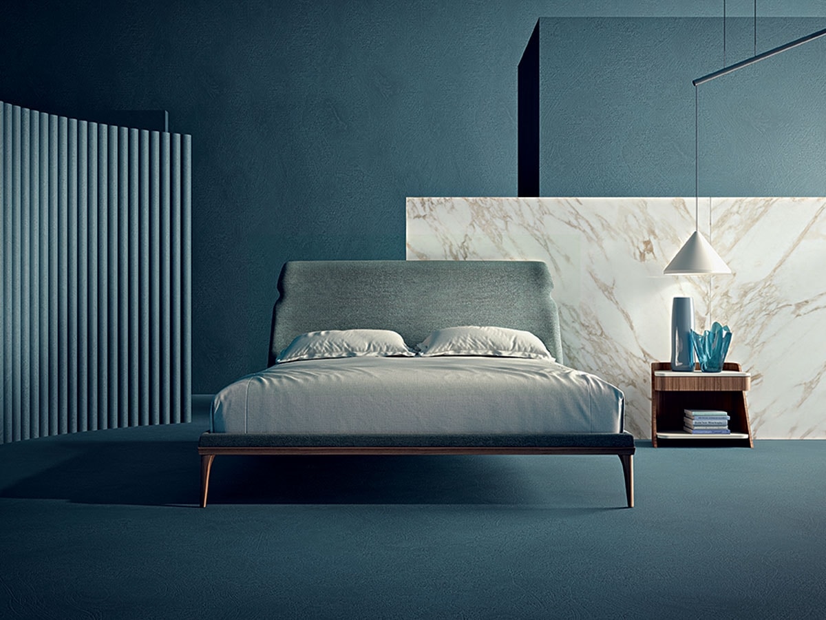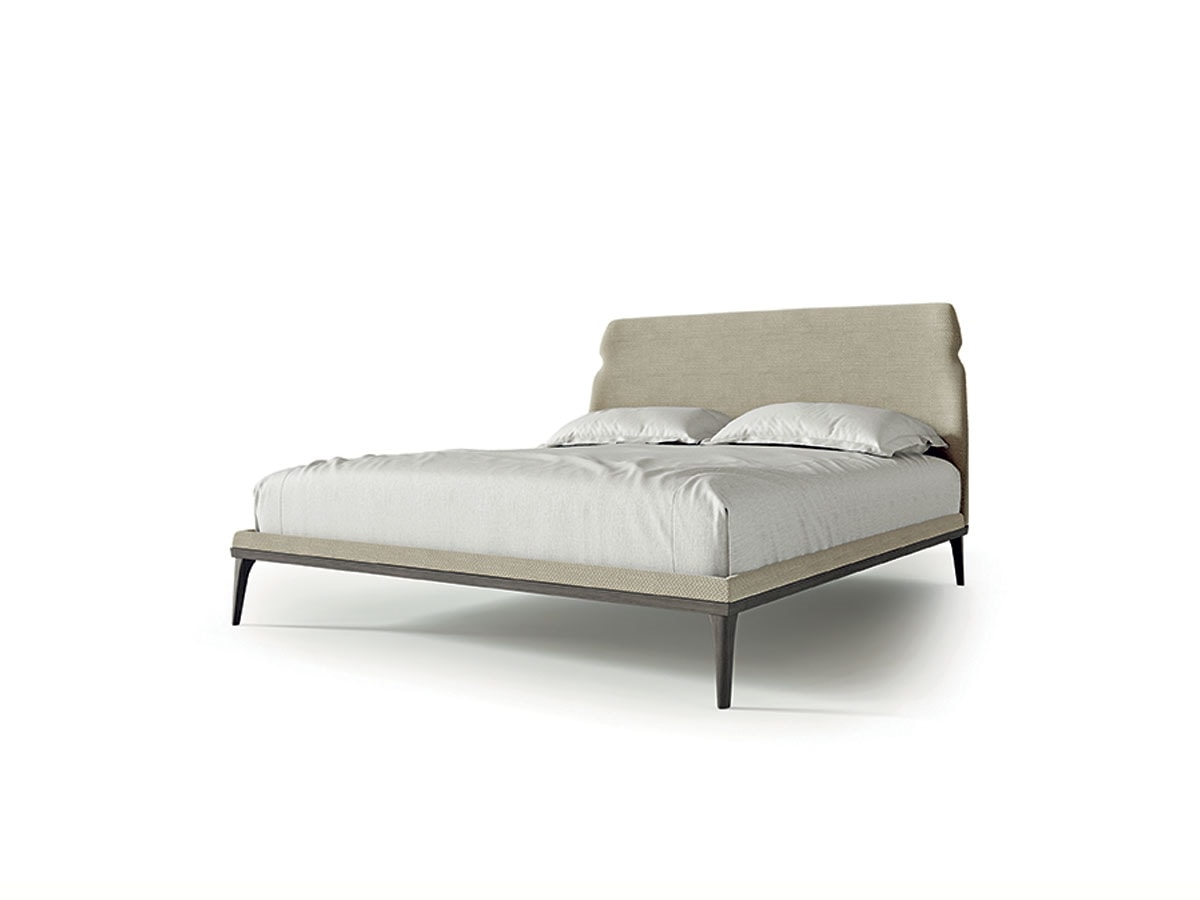 Bett mit gepolstertem, leicht gebogenem Kopfteil, verschönert durch das stilistische Detail, das die Shape-Linie charakterisiert. Füße aus Massivholz in dunkler Tay-Tonalität, auch in Canaletta-Walnuss-Tonalität erhältlich. Auch in King Size erhältlich. In Kombination seine gepolsterte Bank. Polsterung in Stoff, Leder und Nubuk erhältlich.