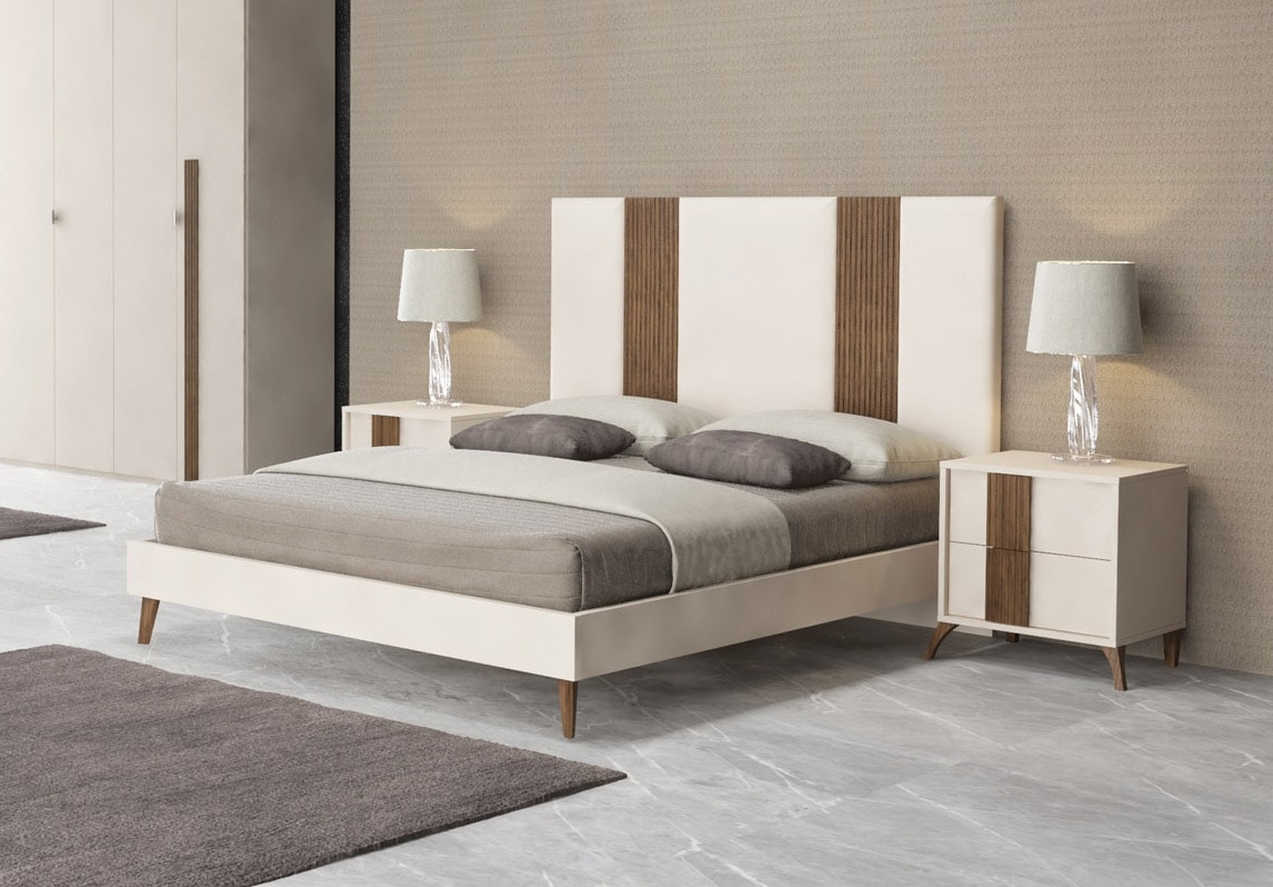 Das Livia -Schlafzimmer ist durch klare Linien und ein minimalistisches Design definiert. Die geriffelten Einsätze, die dank ihrer seitlichen Formung als Griffe doppelt sind, werden aus kompliziert geschnitztem echtem Holz in 3D hergestellt und mit einem Open-Pore-Lack fertiggestellt, wodurch die Teile Wärme und Raffinesse verleihen. Die Beine der Einheiten und des Bettes bestehen ebenfalls aus bemalten Holz und leihen dem Raum ein elegantes und zurückhaltendes Gefühl. Die kontrastierenden Holzeinschüsse sind auch auf der prominenten zweitürigen Schiebergarderobe vorhanden, um ein Gefühl der Kontinuität im gesamten Raum zu gewährleisten.