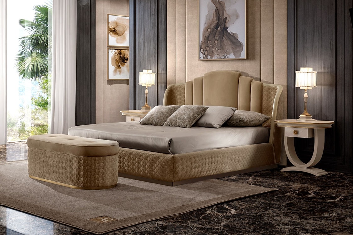 Bett mit Gestell aus Massivholz mit Kopfteil aus gestepptem Stoff Bettleisten aus mehrschichtigem, mit elegantem gestepptem Stoff gepolstertem Profil aus brüniertem Messing.