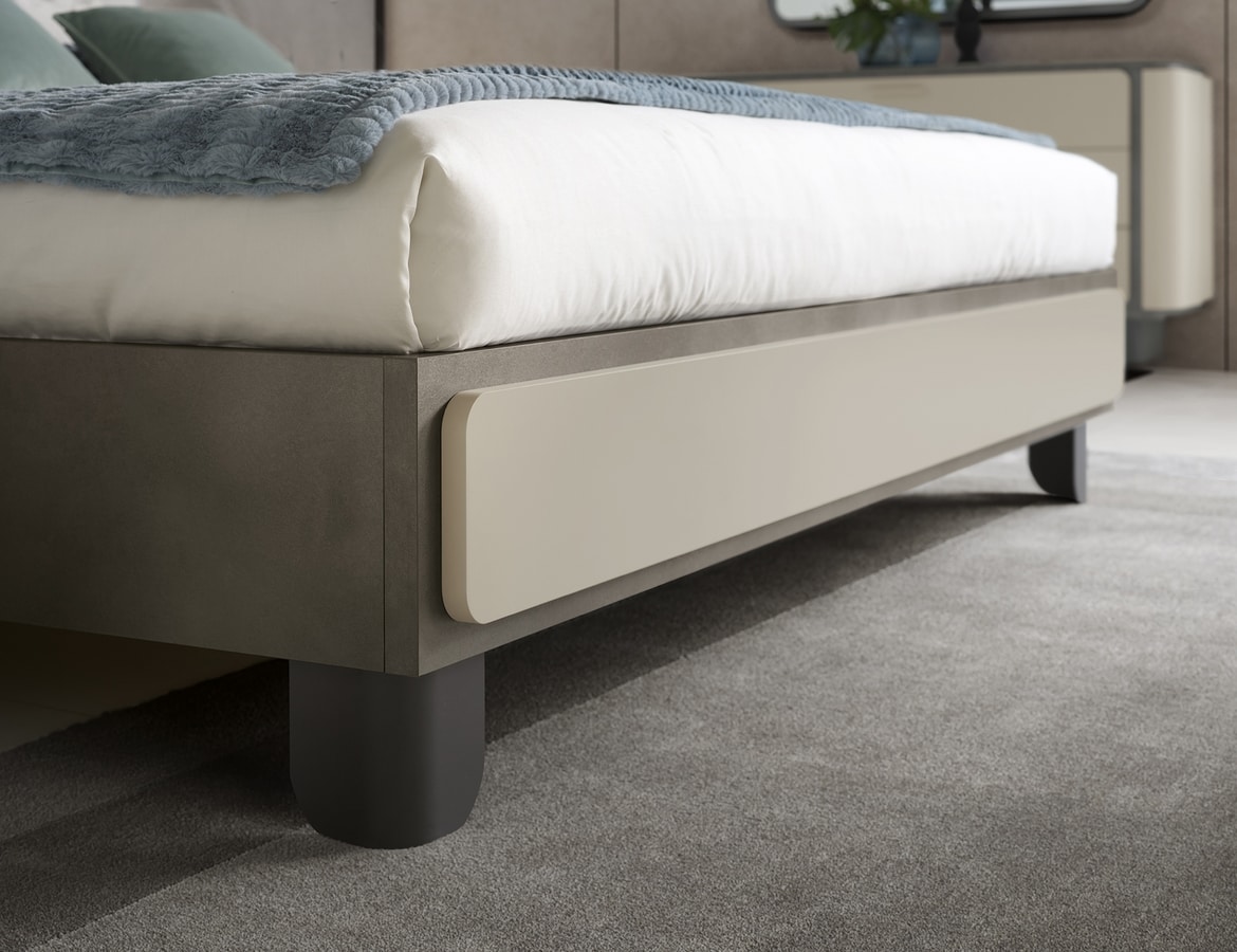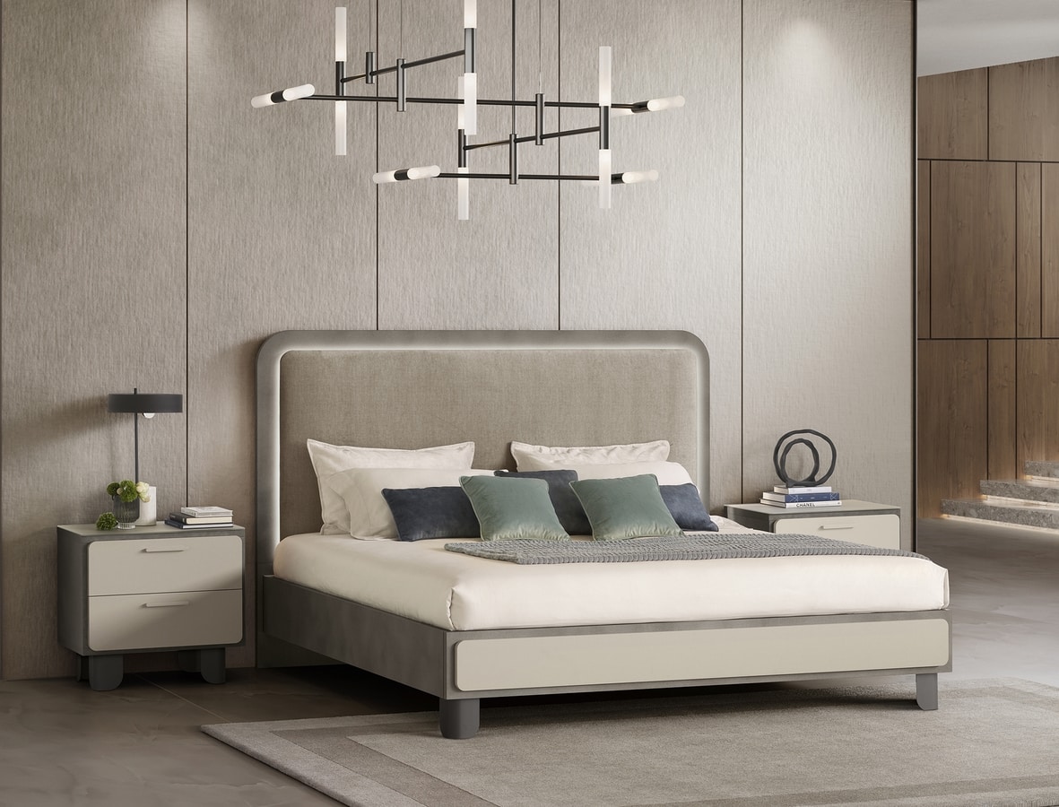 Preise anfordern Ähnliche ProdukteDas Perla-Bett ist in zwei eleganten Versionen erhältlich: eine mit Rahmen und Fußteil in einem raffinierten Kontrast aus Perlgrau und Anthrazit und die andere mit vollständiger Polsterung, die eine weiche, umhüllende Ästhetik bietet, die Stil, Komfort und Harmonie in das Schlafzimmer bringt.