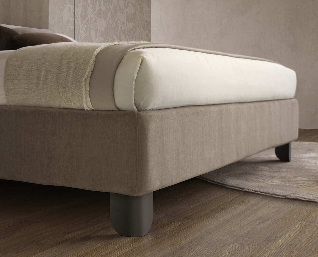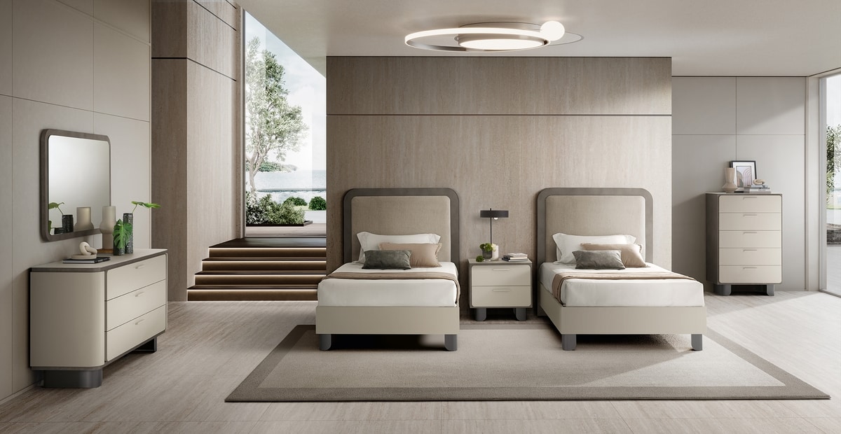 Preise anfordern Ähnliche ProdukteDas Perla-Bett ist in zwei eleganten Versionen erhältlich: eine mit Rahmen und Fußteil in einem raffinierten Kontrast aus Perlgrau und Anthrazit und die andere mit vollständiger Polsterung, die eine weiche, umhüllende Ästhetik bietet, die Stil, Komfort und Harmonie in das Schlafzimmer bringt.