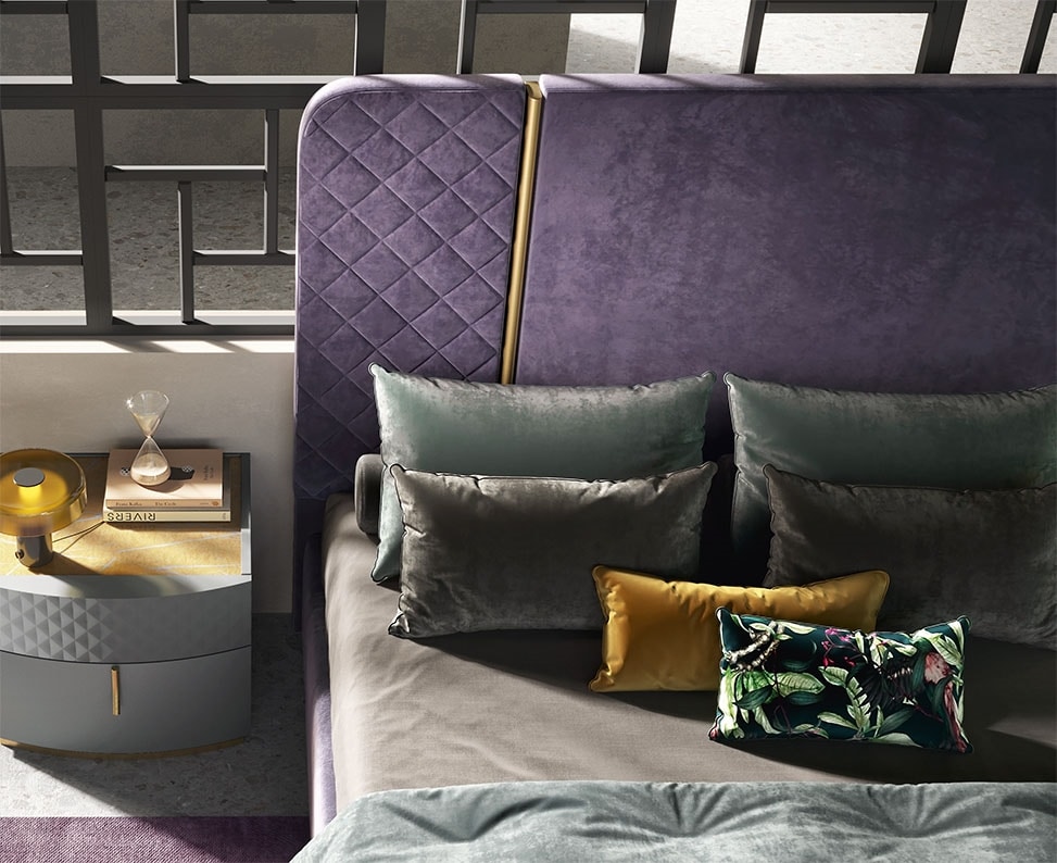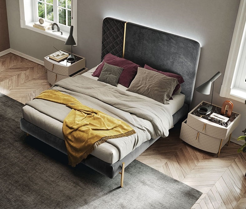 Modernes Bett mit glattem und gestepptem Stoffbezug in den Farben Rauch, Lavendel und Eis. Metallfüße. Kopfteil mit Hintergrundbeleuchtung.